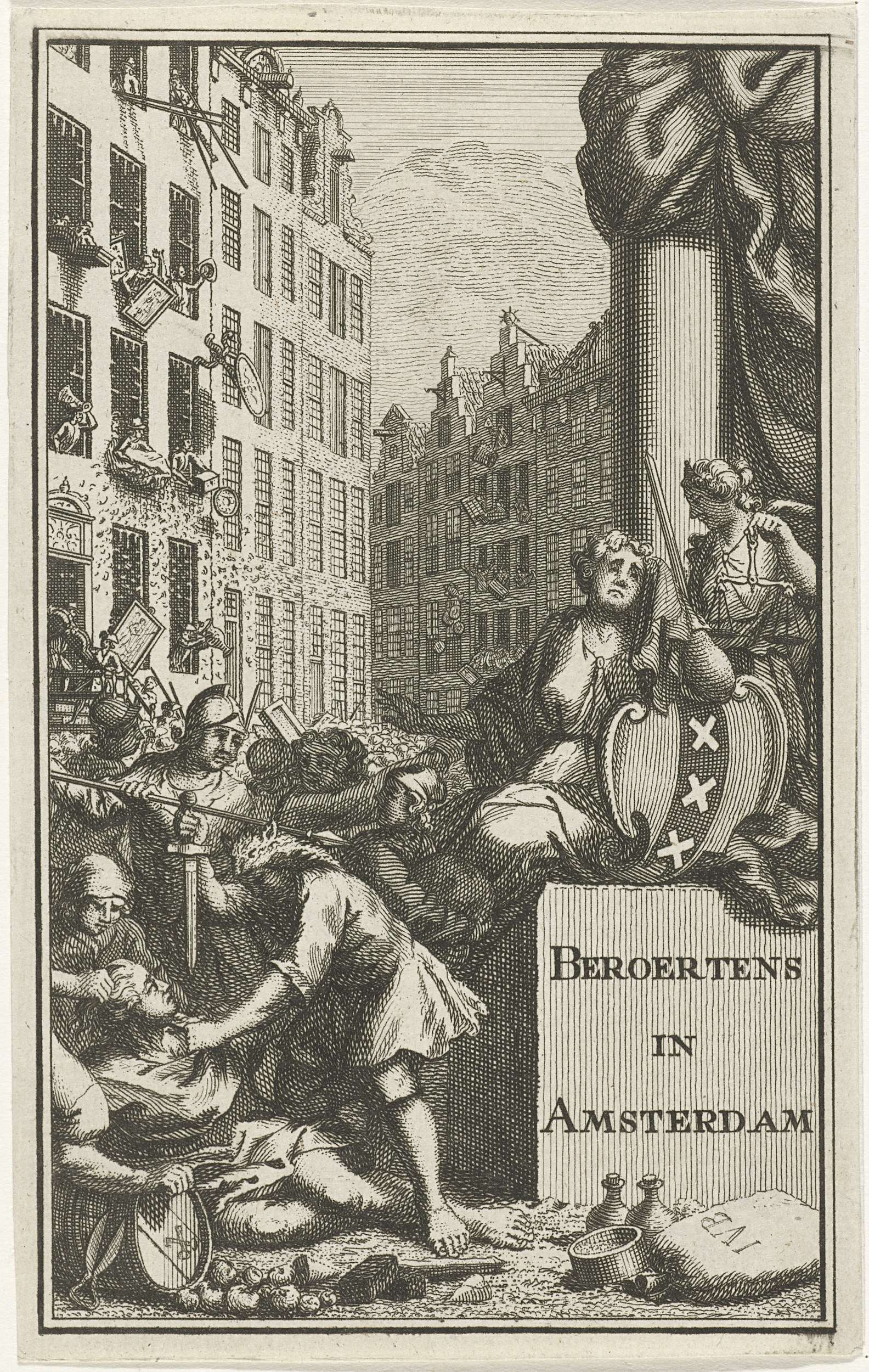 Titelblad voor het boekje: Beknopte historie der beroertens te Amsterdam uit 1748. Treurende stadsmaagd van Amsterdam bij scènes van geweld en plundering bij het Pachtersoproer. Met het opschrift: Beroertens in Amsterdam. Bij de prent behoort een verklaring.