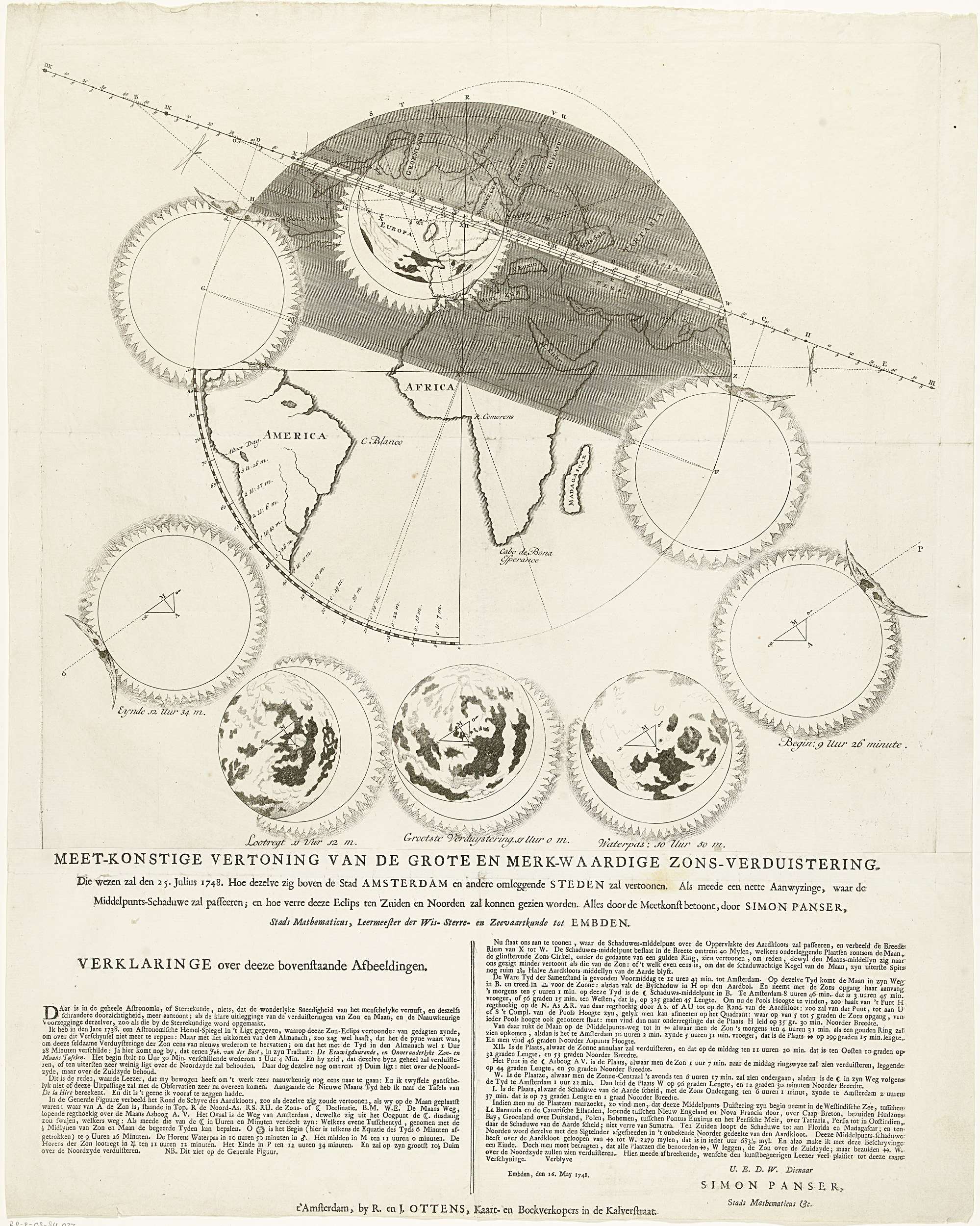 Astronomische voorstelling hoe de onvolledige zonsverduistering van 25 juli 1748 in Amsterdam en omringende plaatsen waarneembaar zal zijn en hoe het een schaduw op het noordelijk halfrond van de aarde zal werpen. Met verschillende stadia van de verduistering. Vastgeplakt onder de plaat een tekstblad met de titel en een verklaring van de voorstelling in twee ...