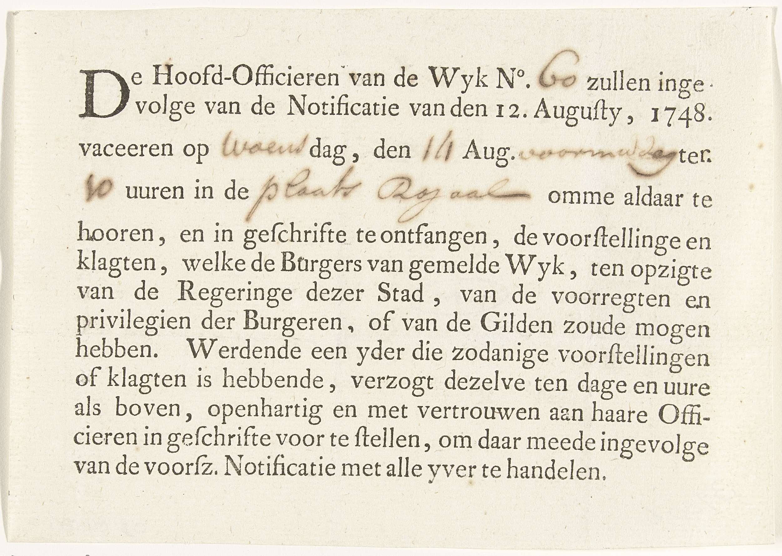 Tekstblad met een gedrukte oproep aan de leden van de schutterij van wijk nr. 60 om zich op 14 augustus 1748 te melden op de Plaats Royaal voor een bijeenkomst over de klachten inzake de privileges en gilden in de stad Amsterdam. Blad met open delen die met de pen zijn ingevuld.