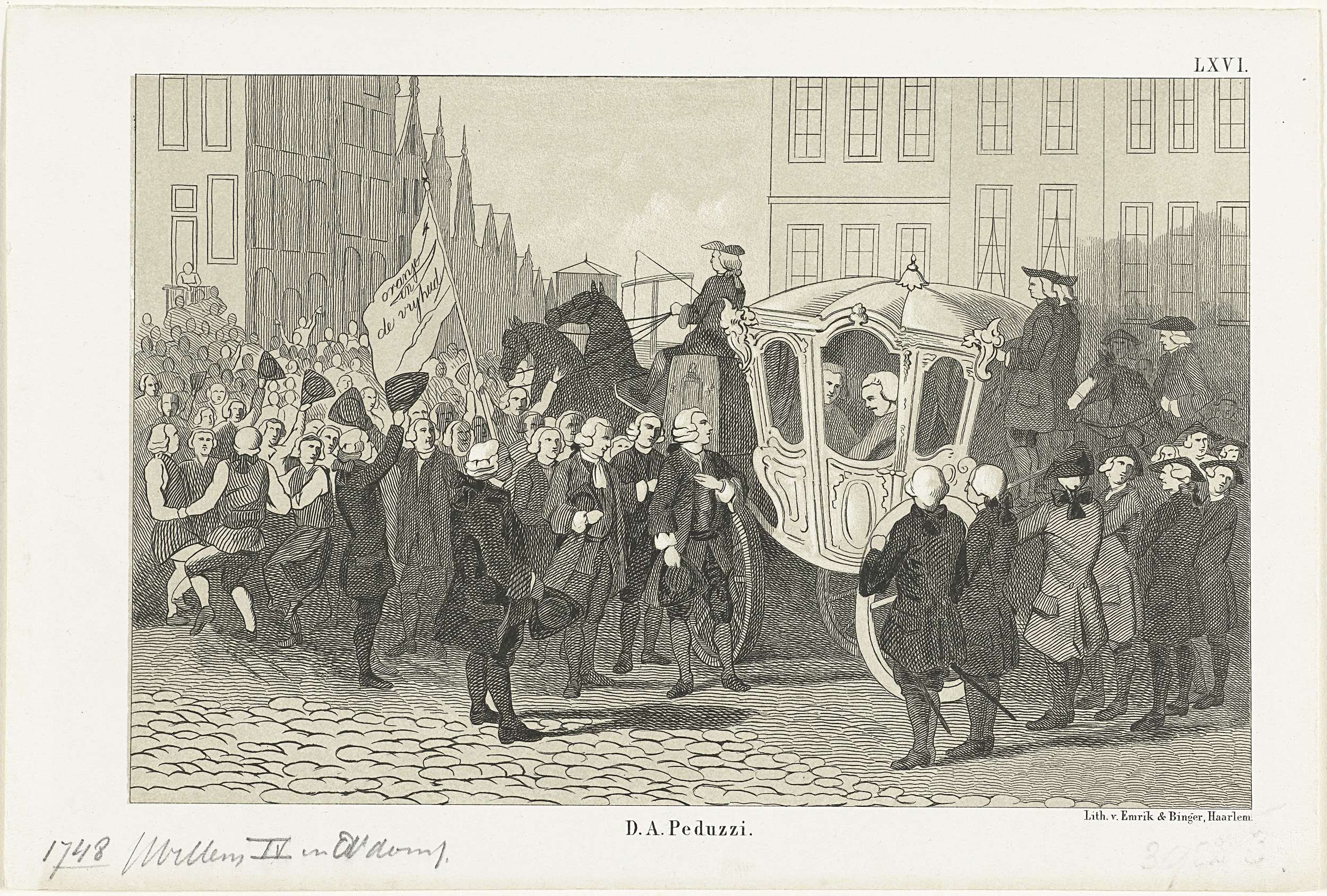 Aankomst van prins Willem IV te Amsterdam op 2 september 1748. De koets met de stadhouder wordt in de straten feestelijk toegejuicht door publiek langs de weg, links de vaandel Oranje en de Vryheid. Genummerd rechtsboven: LXVI.