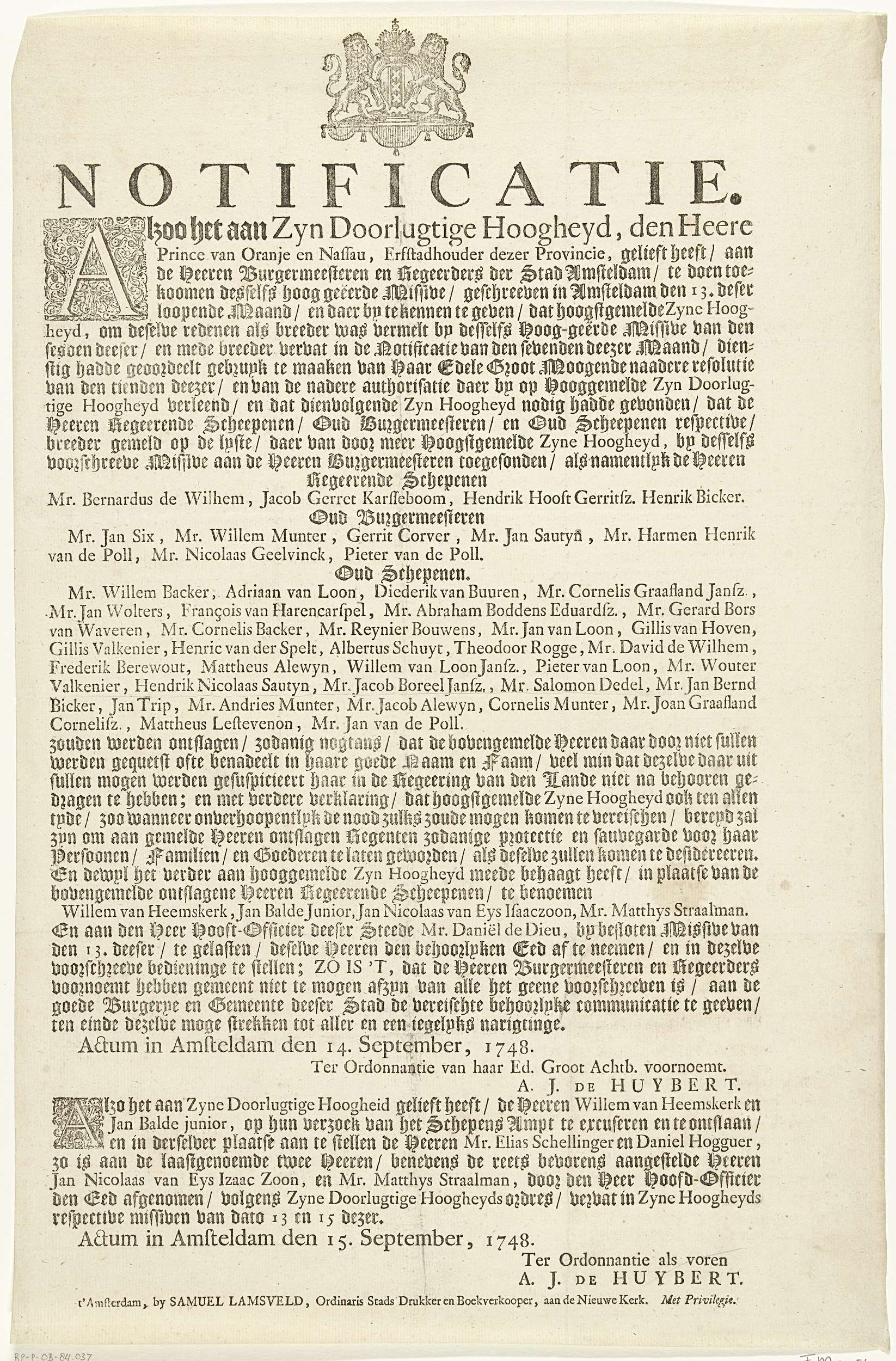 Tekstblad met de bekendmaking namens de prins van de verwijdering van meerdere leden van het stadsbestuur van Amsterdam, 13-15 september 1748. Boven de tekst het wapen van Amsterdam.