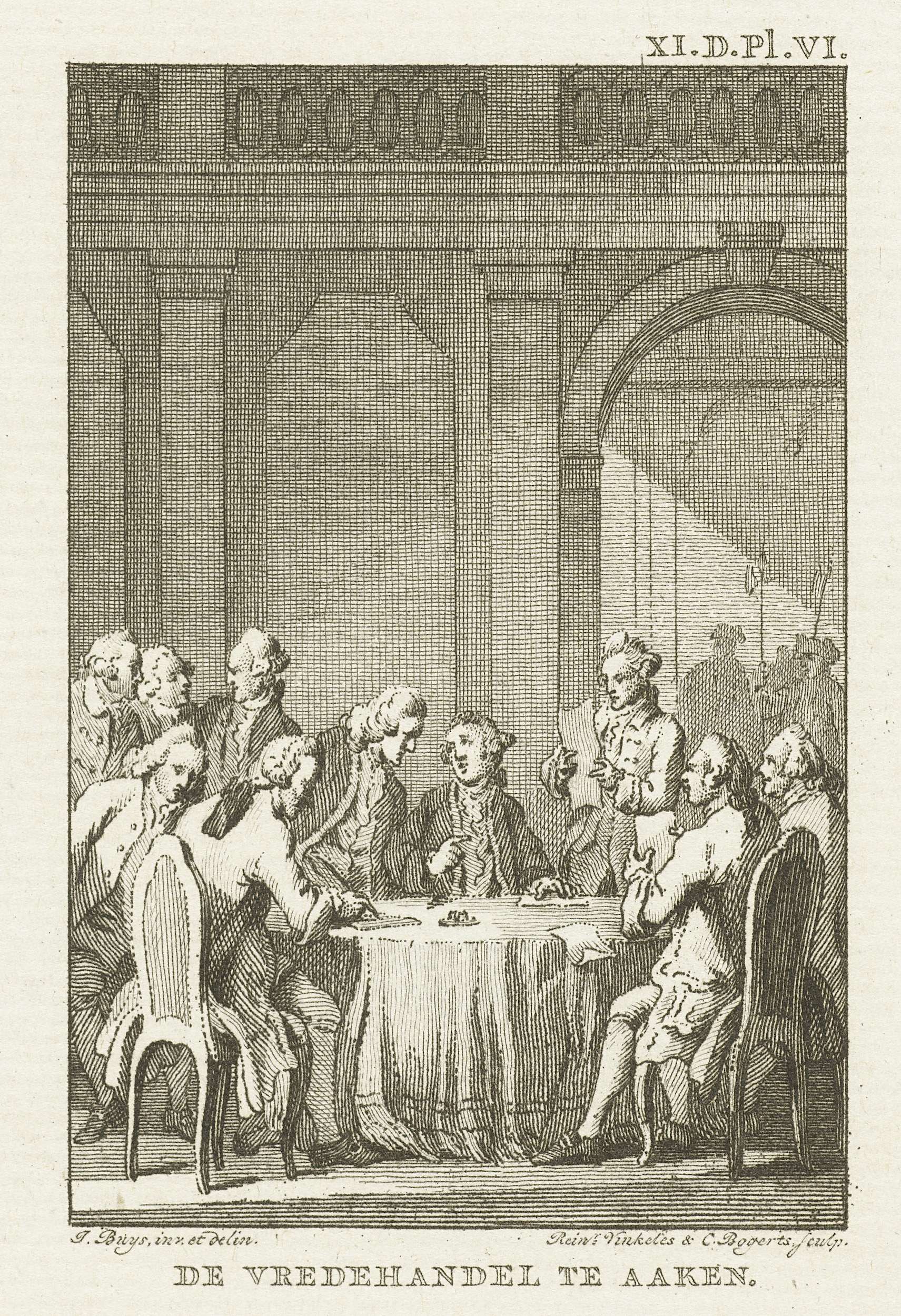Vredesonderhandelingen tussen de Geallieerden (Republiek, Engeland en Oostenrijk) en Frankrijk en Pruisen om de Oostenrijkse Successieoorlog te beëindigen, oktober 1748. Gemerkt rechtsboven: XI. D. Pl. VI.