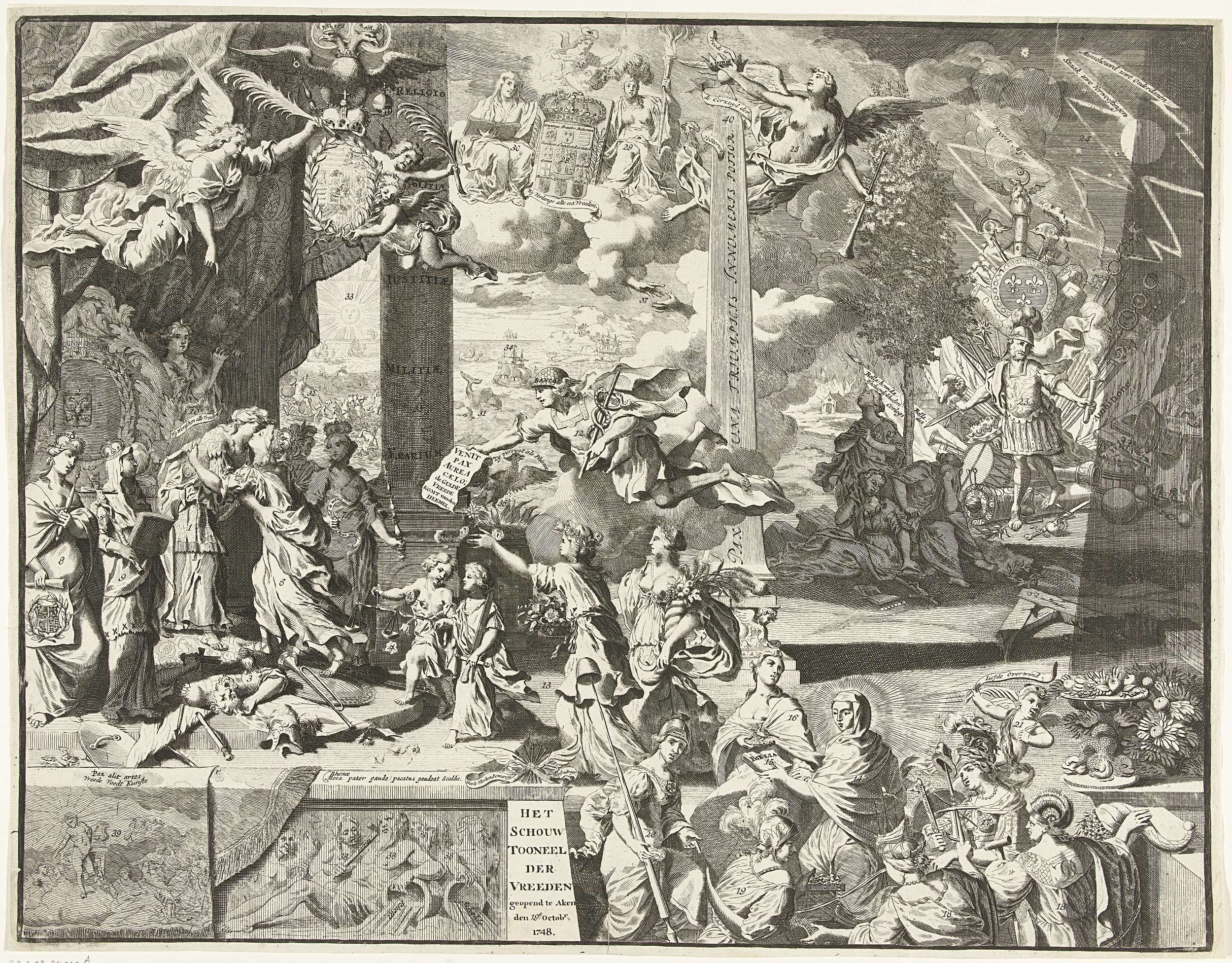 Allegorie op de Vrede van Aken gesloten op 18 oktober 1748 tussen de Geallieerden (Republiek, Engeland en Oostenrijk) enerzijds en Frankrijk, Pruisen en Spanje anderzijds. Links wordt de Franse maagd terug verwelkomd en omhelsd tussen de maagden van de de andere koninkrijken. In het midden Mercurius boven een groep van allegorische vrouwenfiguren. Rechts op de ...