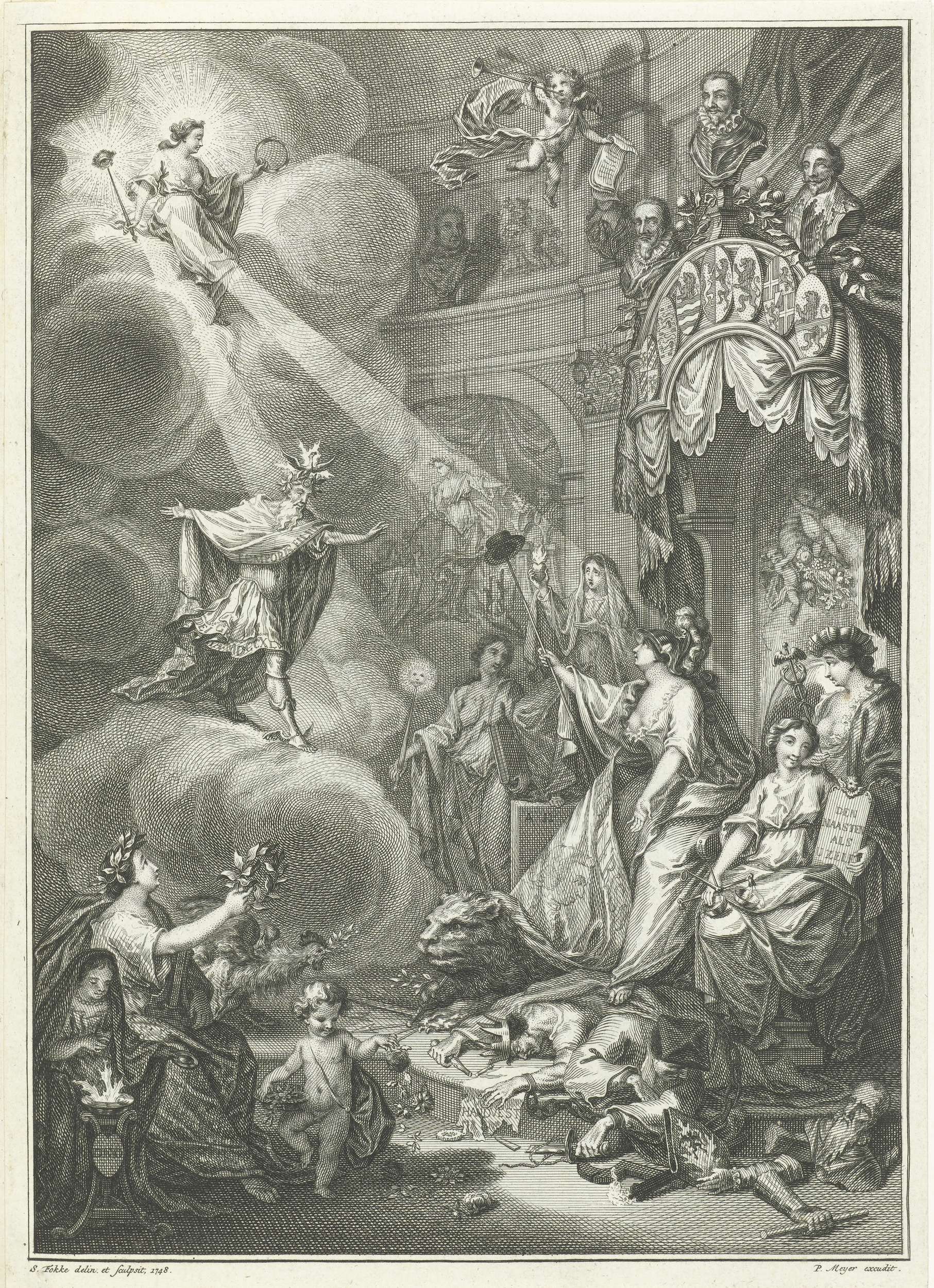 Allegorie op het 100-jarig jubileum van Nederlands Vrijheid, 1648-1748. De personificatie van Nederlands Vrijheid met lans, hoed en vaandel met prins Willem IV ontvangt de Eeuw die uit de wolken afdaalt. Op de troonhemel bustes van Willem I, Maurits en Frederik Hendrik, aan de voeten van de Vrijheid de tijdens de Opstand verslagen vijanden: koning, ...