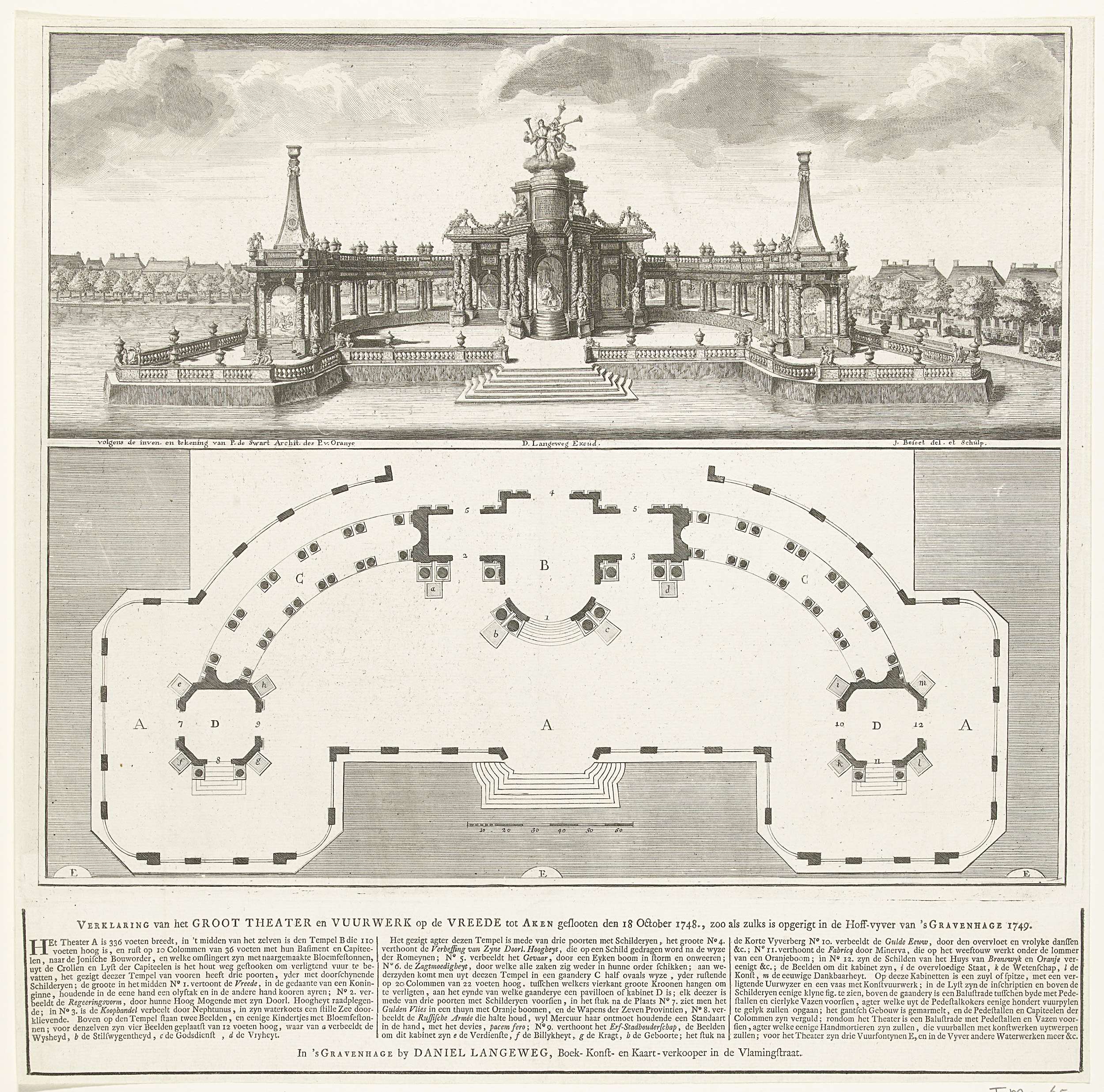Gezicht op en plattegrond van het grote theater opgericht in de Hofvijver te Den Haag voor de illuminatie (11 juni 1749) en het vuurwerk (13 juni 1749) ter ere van de in oktober 1748 gesloten Vrede van Aken. Het theater was ontworpen door hofarchitect Pieter de Swart. Op het blad onder de plaat de verklaring ...
