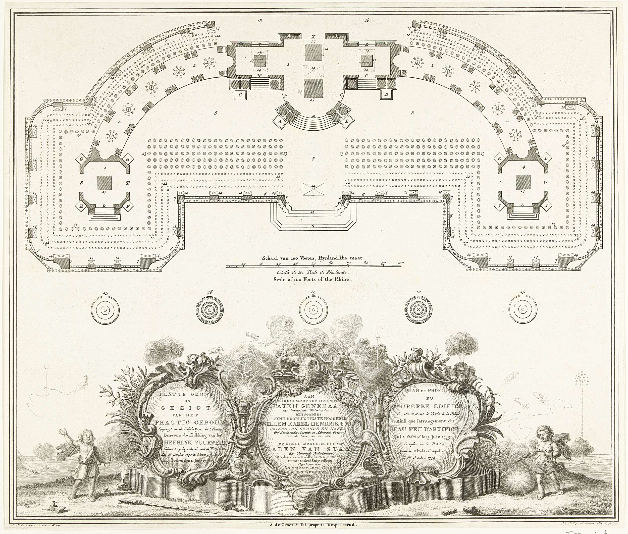 Plattegrond van het grote theater opgericht in de Hofvijver te Den Haag en dat op 13 juni 1749 gebruikt is voor het vuurwerk ter ere van de Vrede van Aken gesloten in 1748. Onderaan cartouches met de titels in het Nederlands en Frans en de opdrachten, met twee figuurtjes met brandende lonten. Bij de plattegrond ...