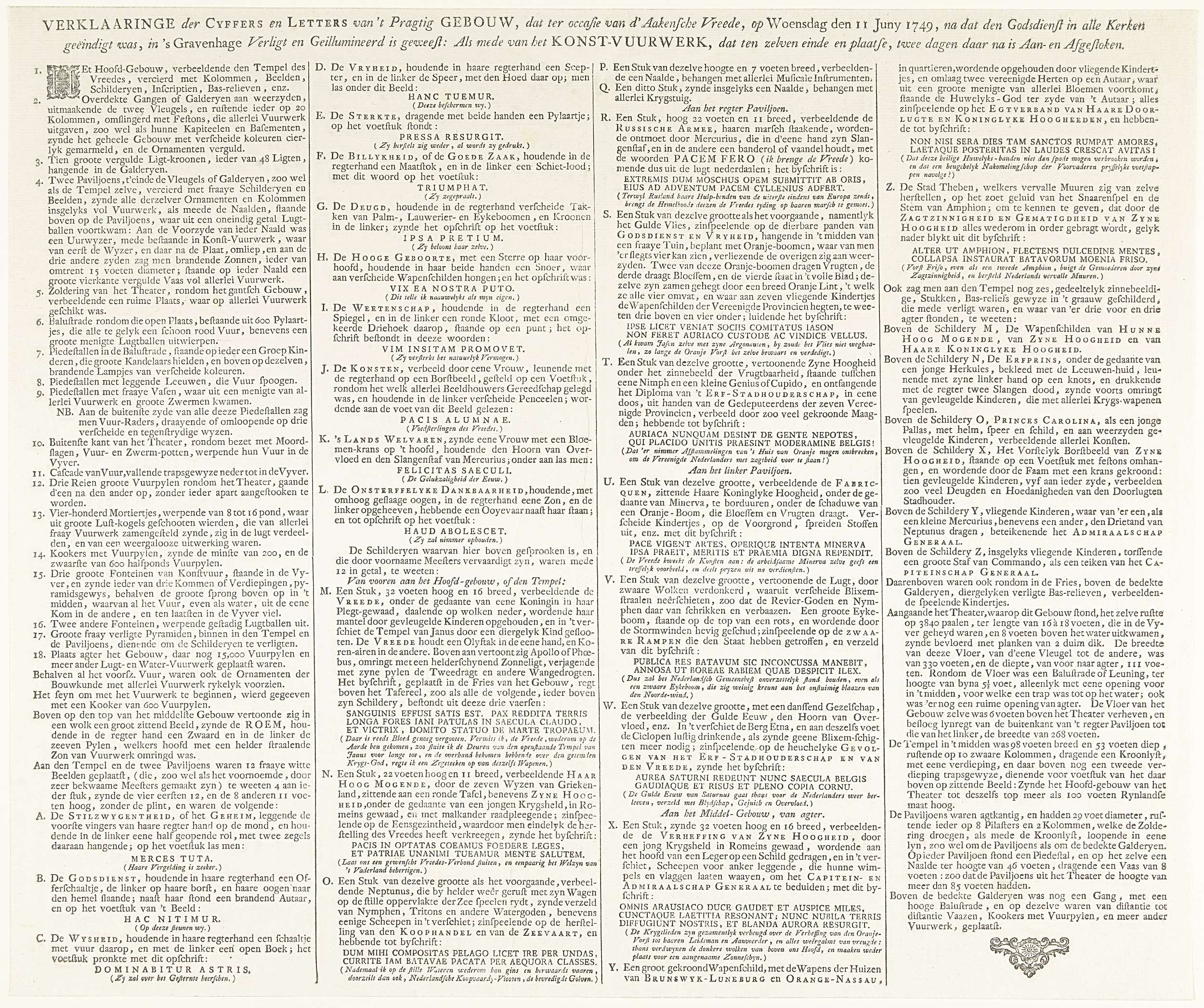 Verklaring bij de prenten van het vuurwerk te Den Haag voor de Vrede van Aken, 1749