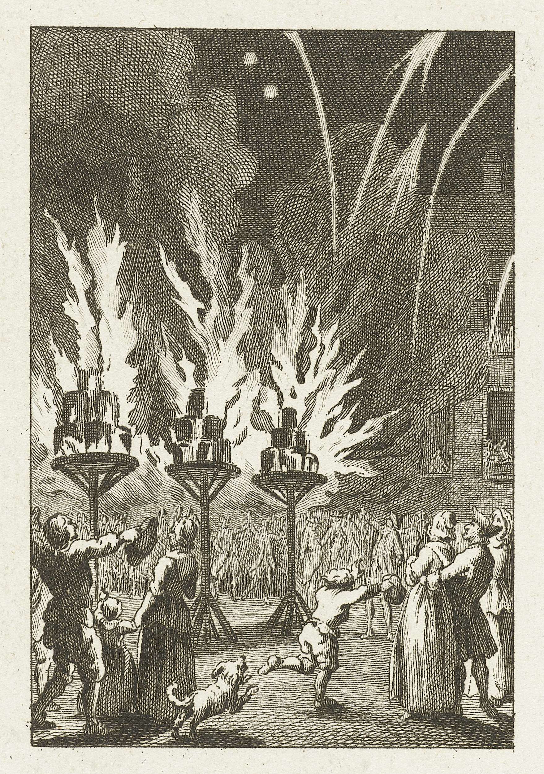 Vreugdevuren en vuurwerk afgestoken te Den Haag op 13 juni 1749 ter ere van de Vrede van Aken gesloten in 1748.