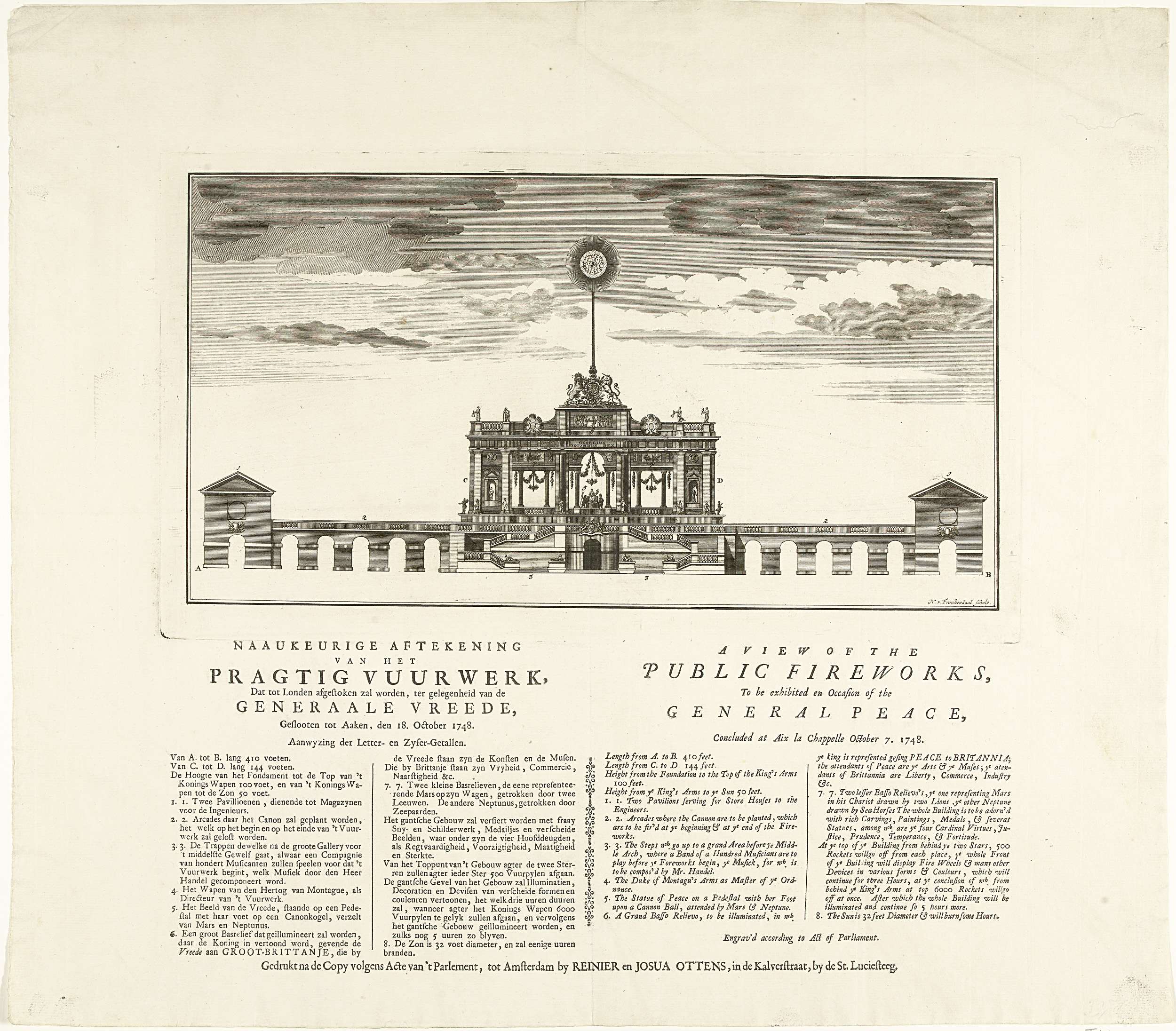 Stellage voor het vuurwerk dat op 27 april 1749 in Green Park te Londen afgestoken zal worden ter gelegenheid van de Vrede van Aken, gesloten op 18 oktober 1748. Dit is gebeurtenis waarvoor G.F. Händel de Music for the Royal Fireworks schreef. Aanzicht van het bouwwerk, op het blad onder de plaat de titels en ...