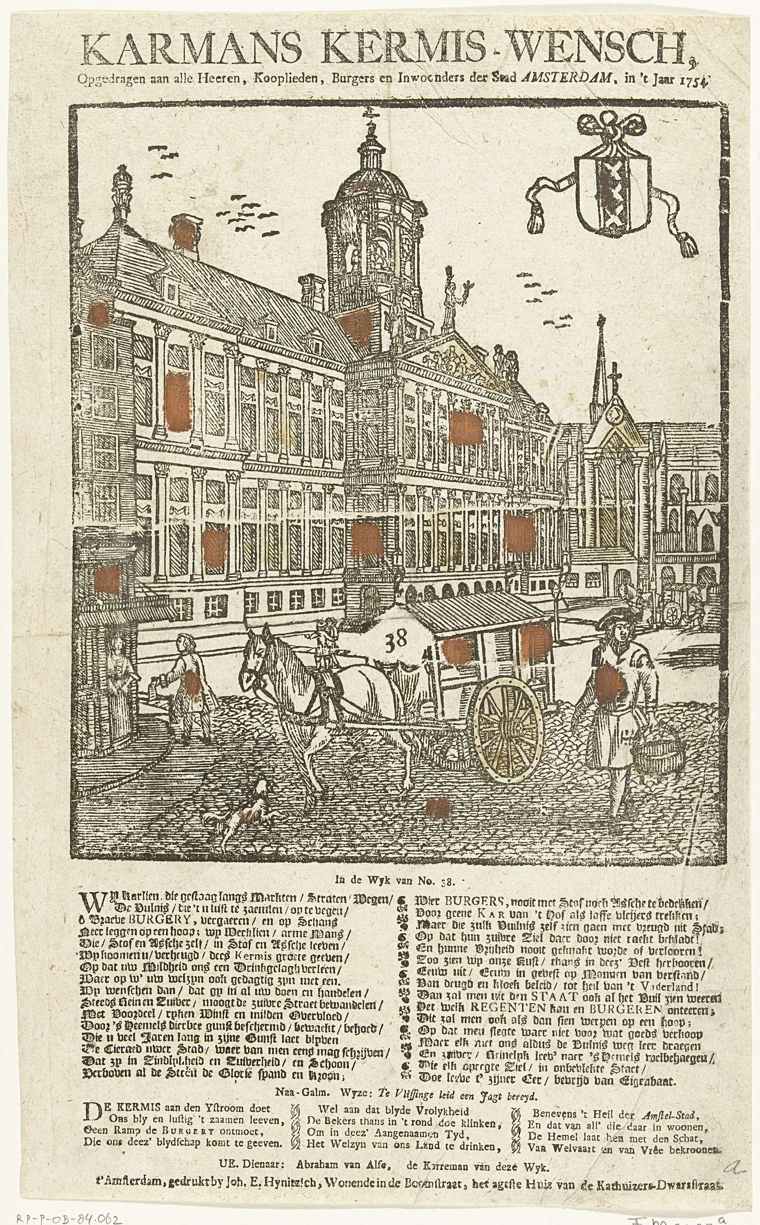 Kermisprent voor het jaar 1754 van Abraham van Alse, de karrenman (askarrenman of vuilnisman) in de wijk 38, opgedragen aan de burgers van Amsterdam. Paard met askar gemerkt 38 op de Dam voor het Stadhuis. Op het blad onder de voorstelling een vers in twee kolommen met een lied in de nagalm in drie kolommen.