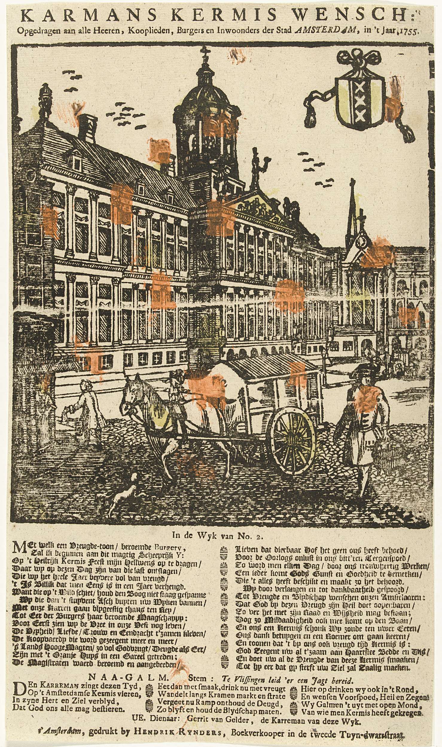 Kermisprent voor het jaar 1755 van Gerrit van Gelder, de karrenman (askarrenman of vuilnisman) in de wijk 2, opgedragen aan de burgers van Amsterdam. Paard met askar gemerkt 2 op de Dam voor het Stadhuis. Op het blad onder de voorstelling een vers in twee kolommen met een lied in de nagalm in drie kolommen.