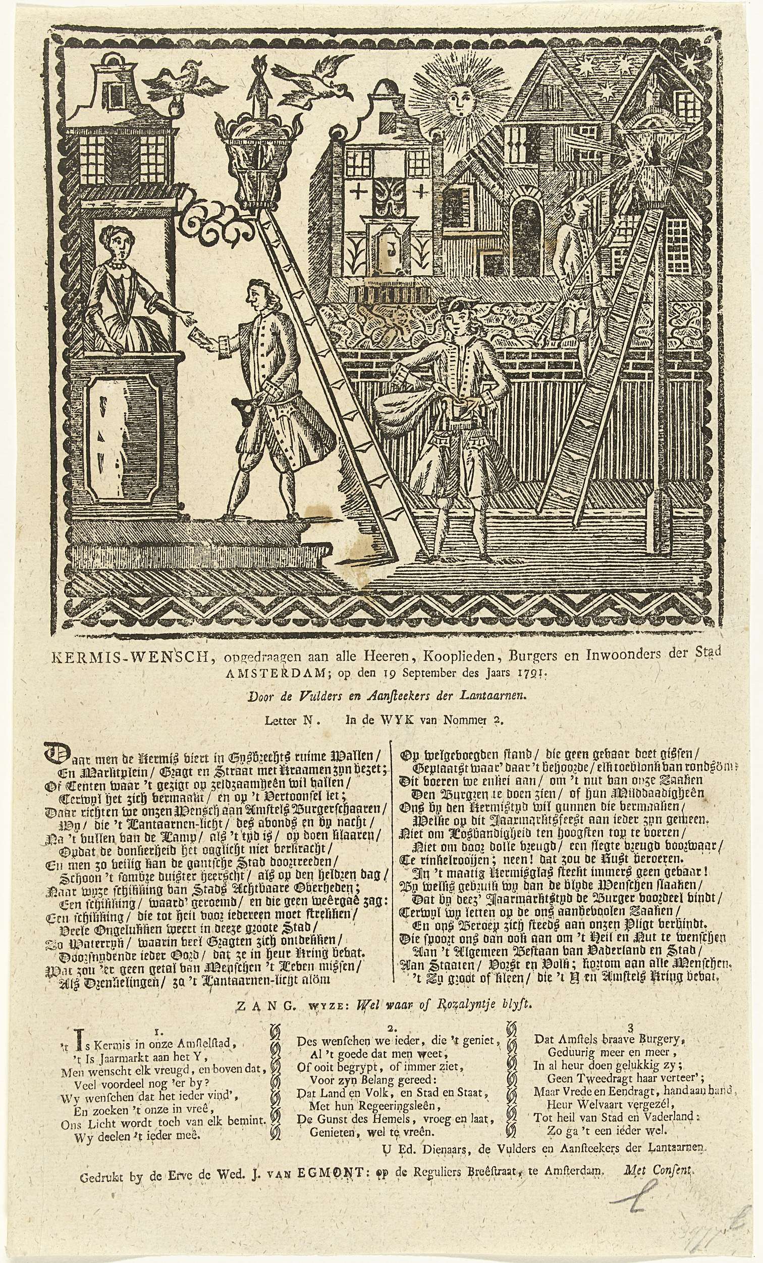 Kermisprent voor het jaar 1791 van de Amsterdamse lantaarnopstekers in wijk nr. 2, opgedragen aan de burgers van Amsterdam. Lantaarnopstekers aan het werk op straat overdag en 's avonds. Op het blad onder de voorstelling een vers in twee kolommen met in de toezang een lied in drie kolommen.