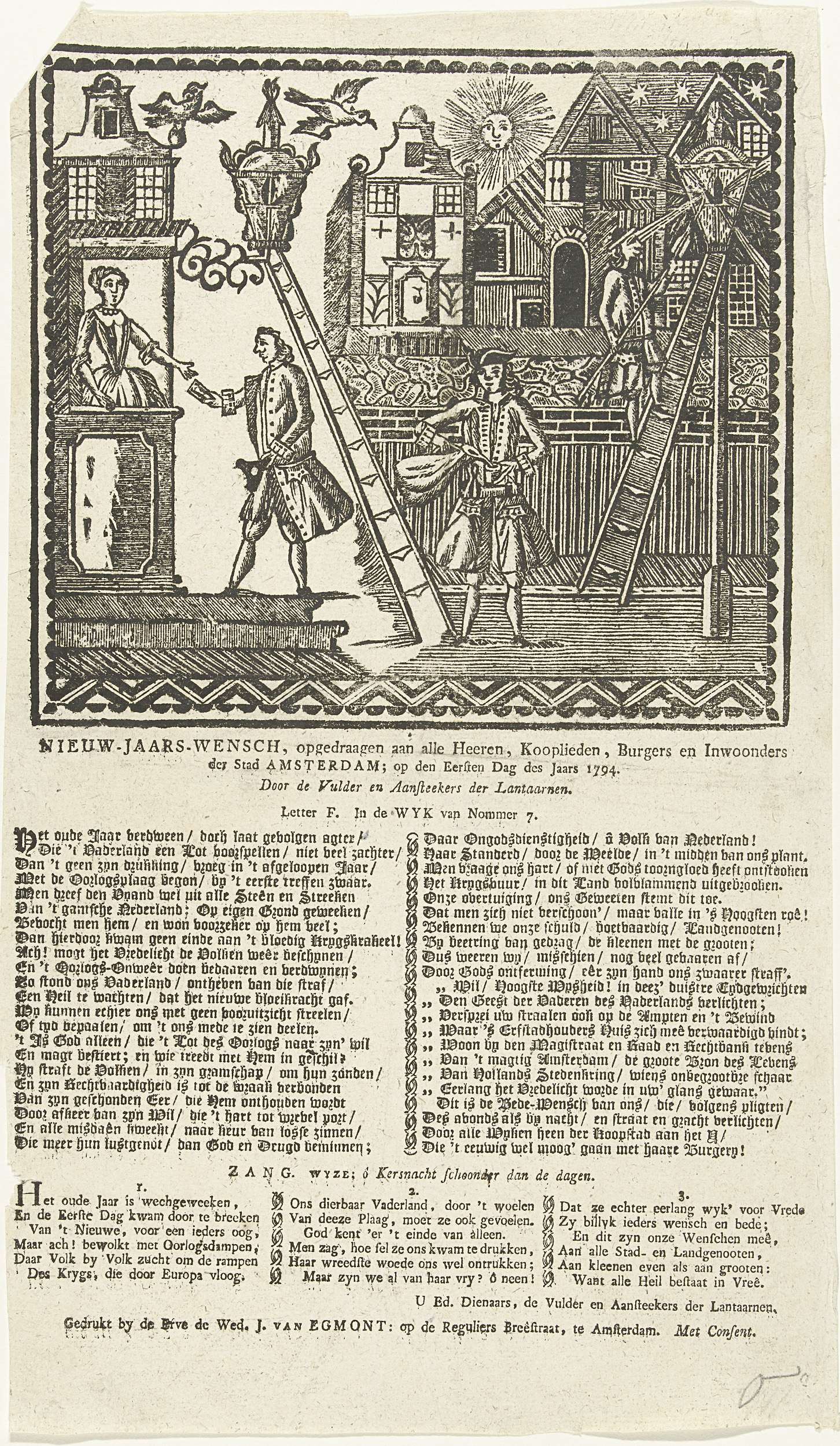Nieuwjaarsprent voor het jaar 1794 van de Amsterdamse lantaarnopstekers in wijk nr. 7, opgedragen aan de burgers van Amsterdam. Lantaarnopstekers aan het werk op straat overdag en 's avonds. Op het blad onder de voorstelling een vers in twee kolommen met in de toezang een lied in drie kolommen.
