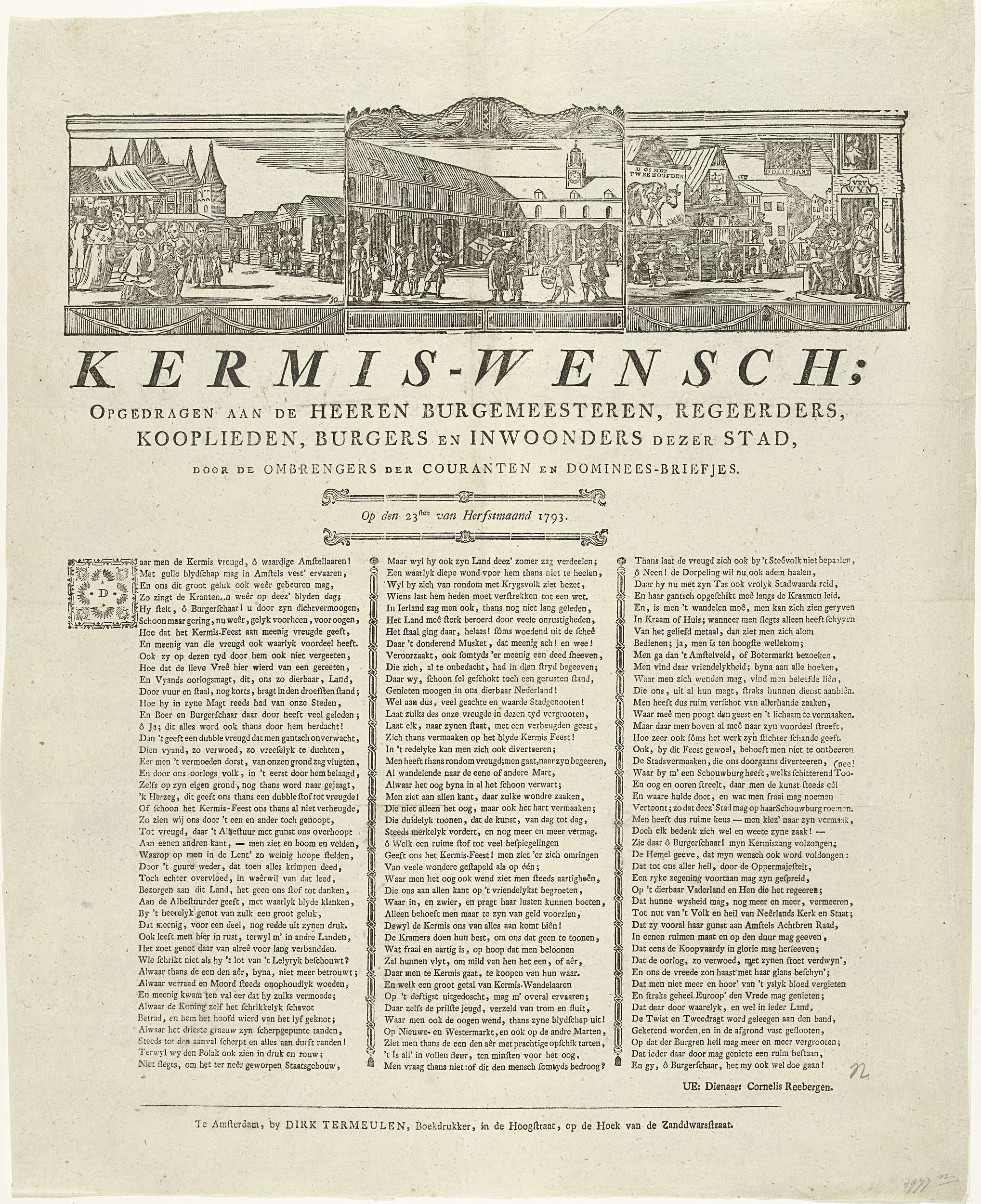 Kermisprent van de Amsterdamse courantbezorger Cornelis Reebergen voor het jaar 1793, opgedragen aan de burgers van Amsterdam. Bovenaan drie voorstellingen te Amsterdam: de kermis bij de Waag op de Nieuwmarkt, op het binnenplein van de beurs van Hendrik de Keyser en op de Botermarkt. Onder de voorstellingen een vers in drie kolommen.
