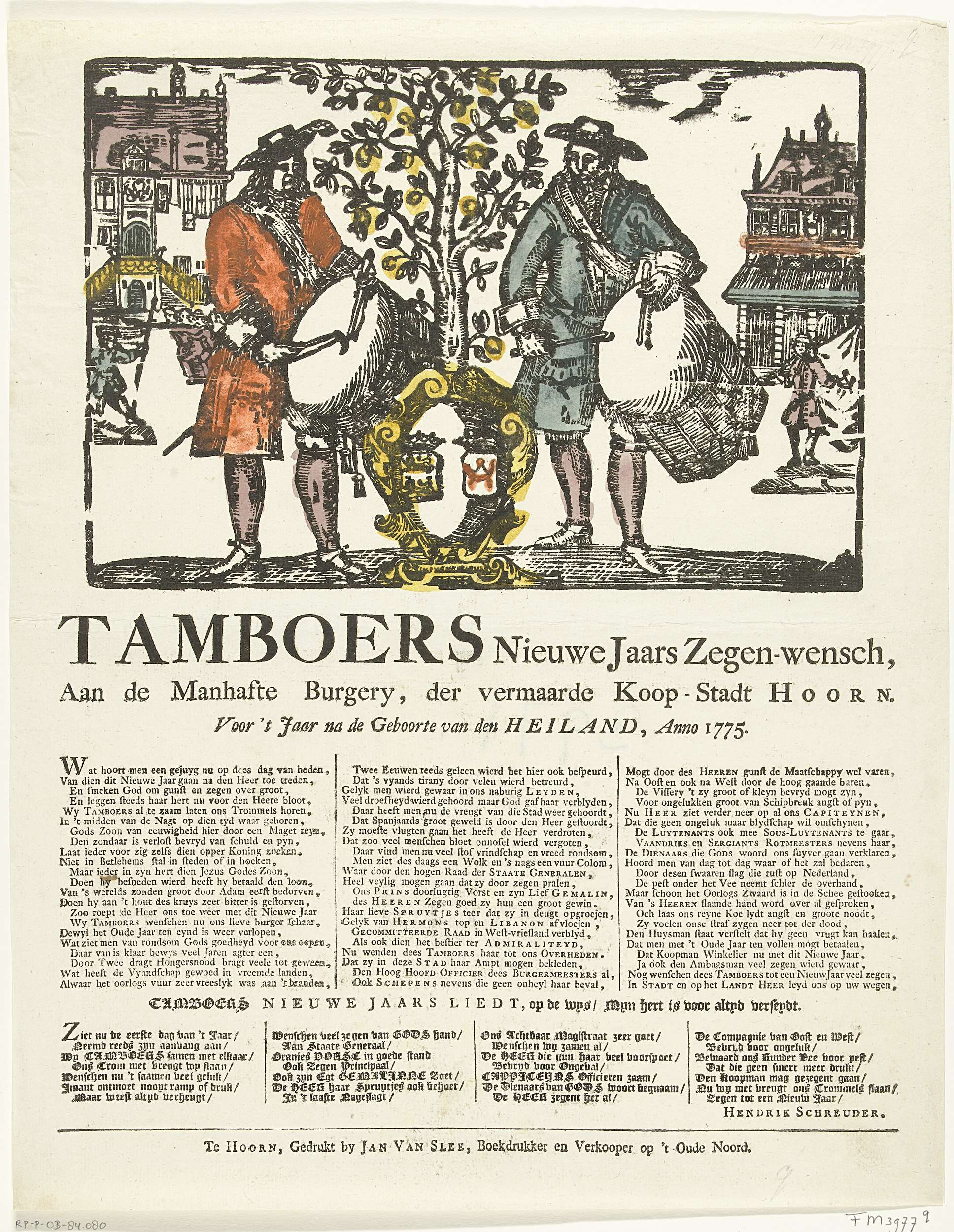 Nieuwjaarsprent van de tamboers van de stad Hoorn voor het jaar 1775. Opgedragen aan de inwoners van Hoorn. Twee tamboers met trommels bij een Oranjeboom met de wapens van Hoorn en West-Friesland. Op de achtergrond het oude stadhuis en de Waag. Op het blad onder de voorstelling een vers in drie kolommen met onderaan een ...
