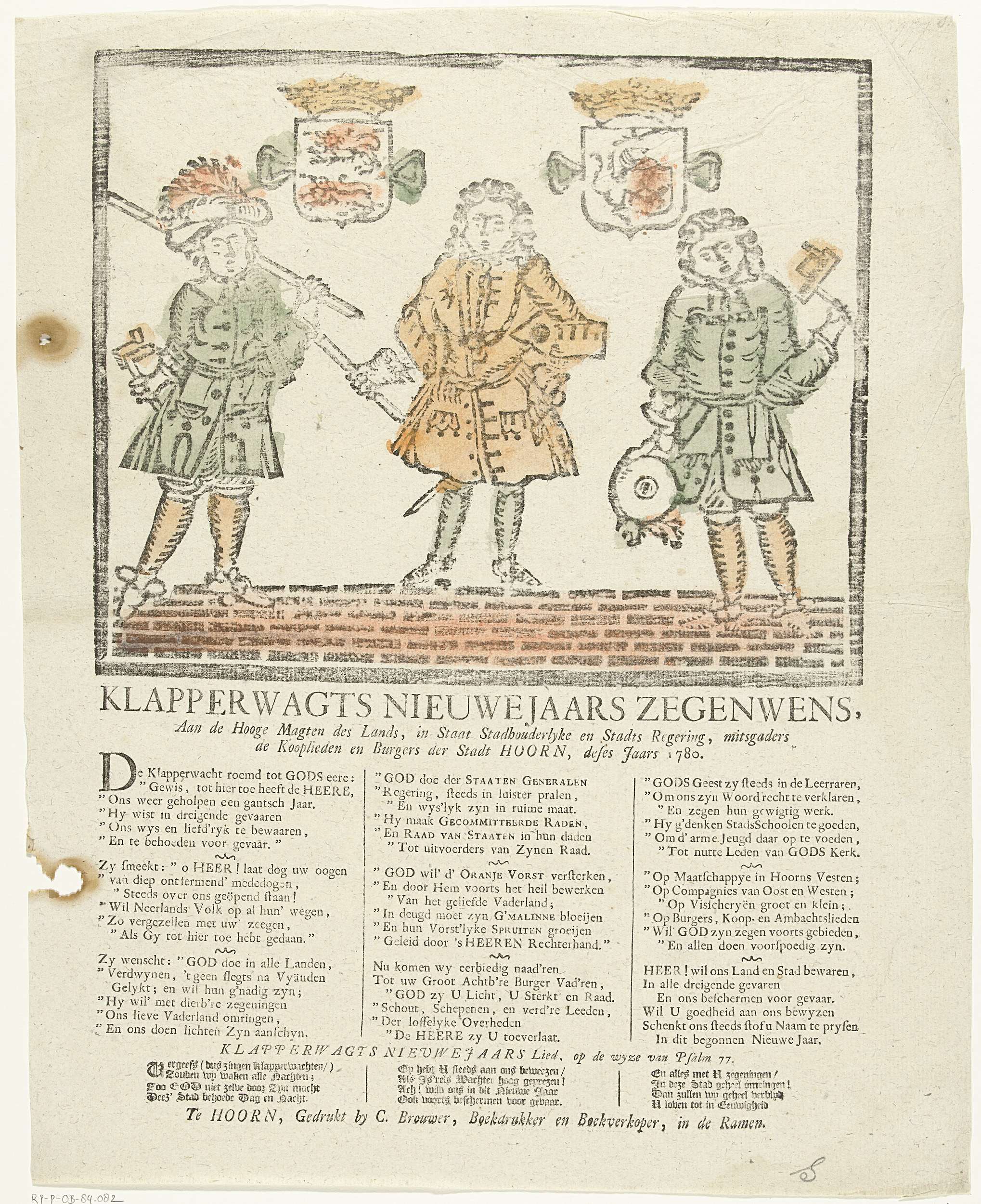 Nieuwjaarsprent van de klapperwacht (ratelwacht of nachtwacht) van de stad Hoorn voor het jaar 1780. Opgedragen aan de bestuurders en inwoners van Hoorn. Twee leden van de wacht met een officier, met de wapens van West-Friesland en Hoorn. Op het blad onder de voorstelling een vers in drie kolommen met onderaan een lied in drie ...