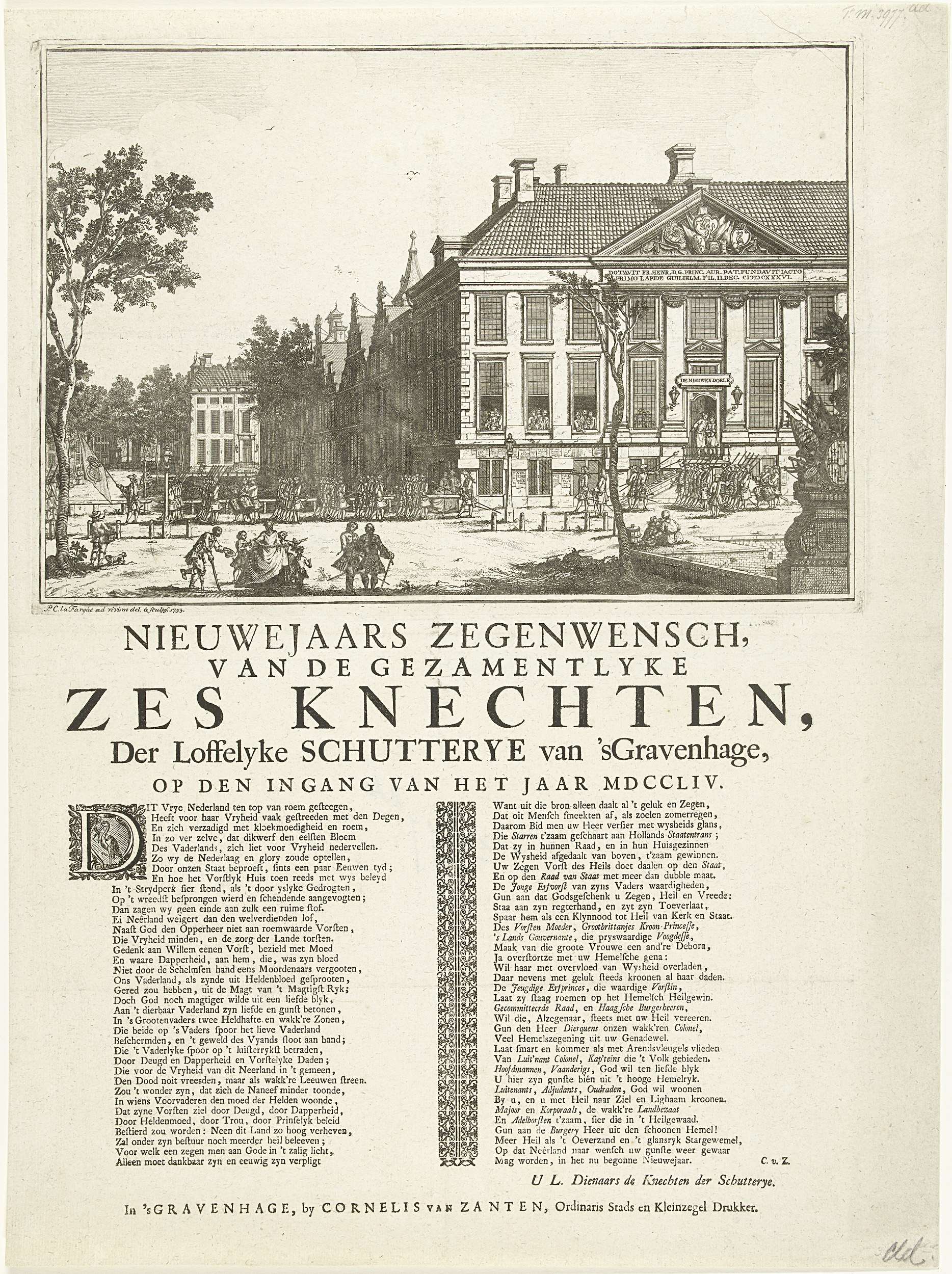 Nieuwjaarsprent van de zes knechten van de Haagse schutterij voor het jaar 1754. Gezicht op de Nieuwe Doelen (Sint Sebastiaansdoelen) aan de Korte Vijverberg met exercerende schutterij. Op het blad onder de voorstelling een vers in twee kolommen.