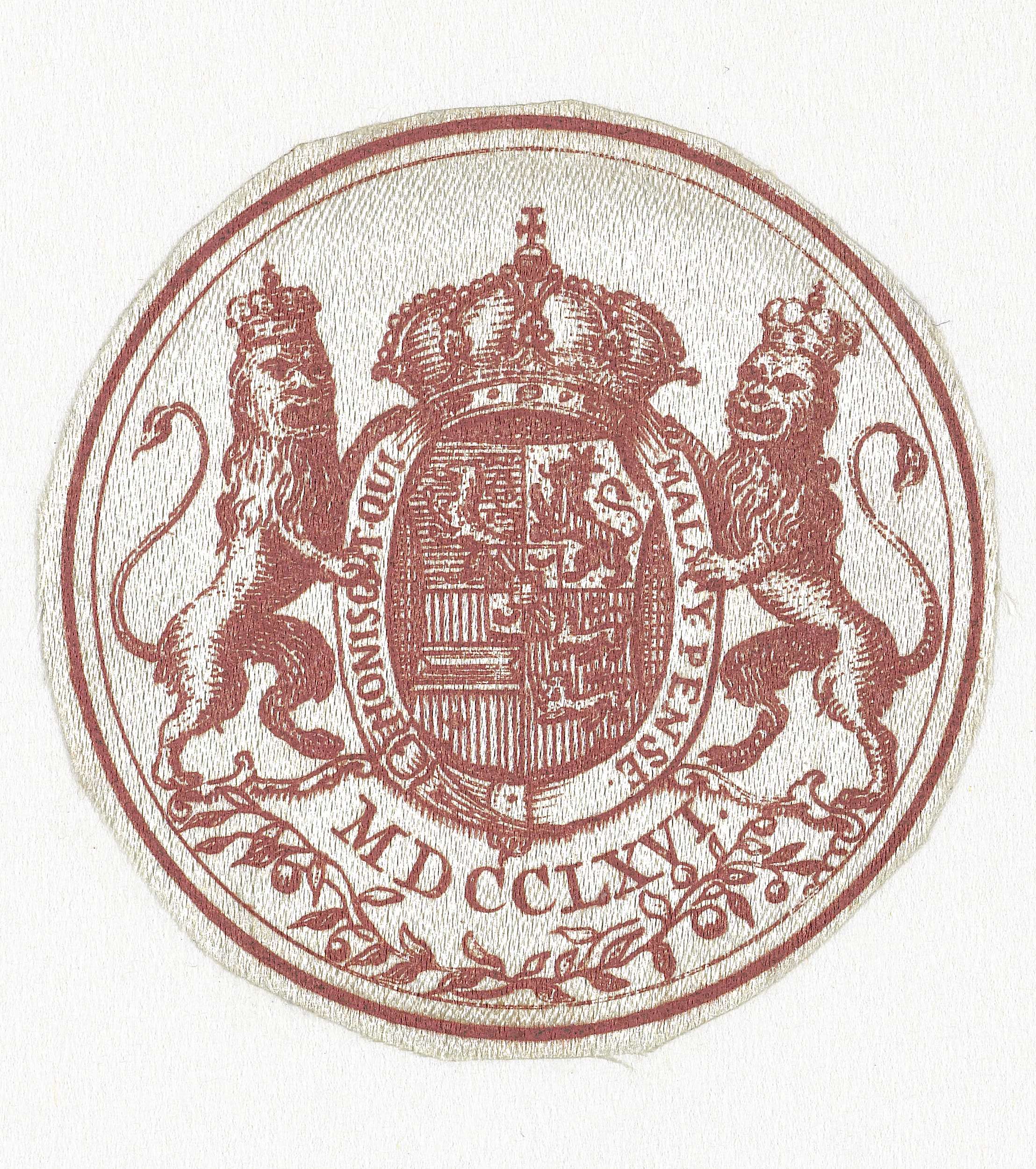 Het wapen van Engeland, variant van het type zoals werd het gedragen in een kokarde op de hoed bij de verkiezing van Willem IV tot stadhouder, mei 1747. Uitgeknipt en op een stuk papier geplakt met opschrift. Dit exemplaar echter met het jaartal 1766.