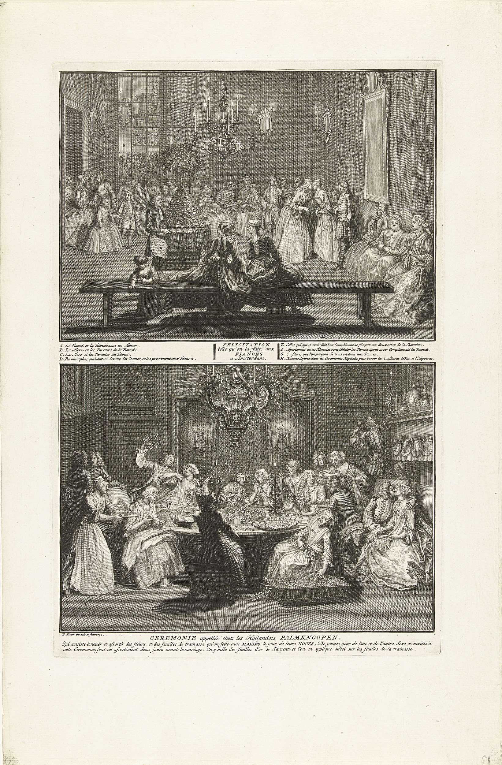 Twee voorstellingen over huwelijksgebruiken bij de hervormden in Amsterdam, ca. 1730. In de bovenste voorstelling neemt het verloofde paar felicitaties en geschenken in ontvangst. In de onderste voorstelling het palmknopen, het knopen van bloemen- en bladerkransen door het verloofde paar en vrienden. Met onderschriften in het Frans.