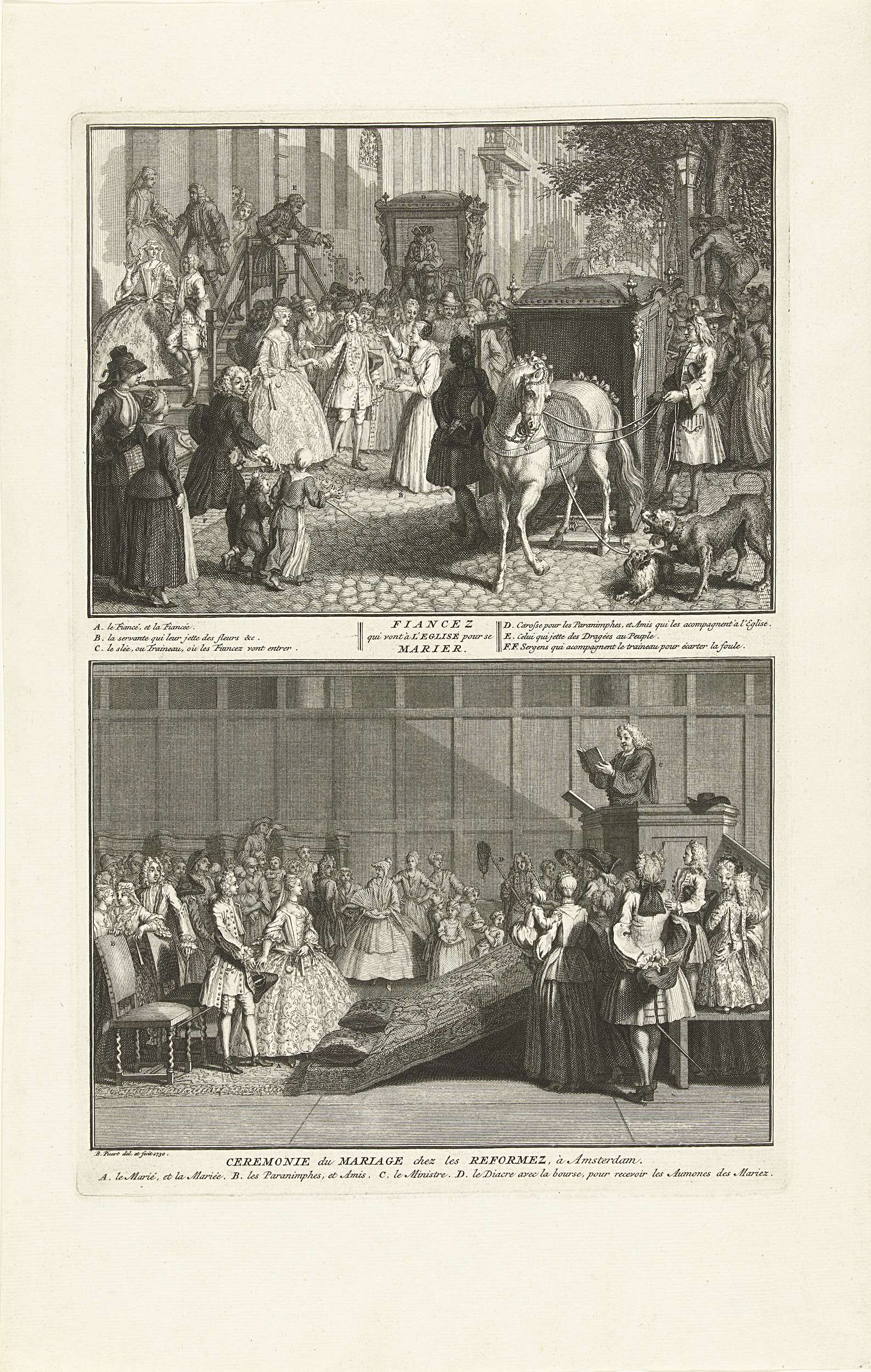 Twee voorstellingen over huwelijksgebruiken bij de hervormden in Amsterdam, ca. 1730. In de bovenste voorstelling verlaat het verloofde paar het huis om plaats te nemen in de toeslede die het paar naar de kerk zal brengen. In de onderste voorstelling de huwelijksceremonie in de kerk. Met onderschriften in het Frans.