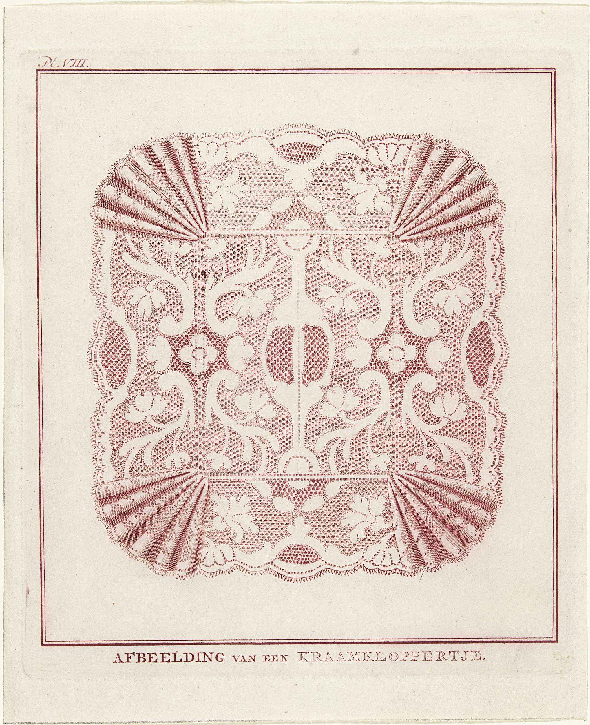 Een kanten kraamkloppertje. Gebruikt ca. 1750 in Haarlem om onder de deurklopper aan de deur te hangen om het geluid van de klopper te verzachten en om aan te geven dat er een kind in het huis was geboren. Gemerkt linksboven: Pl. VIII.