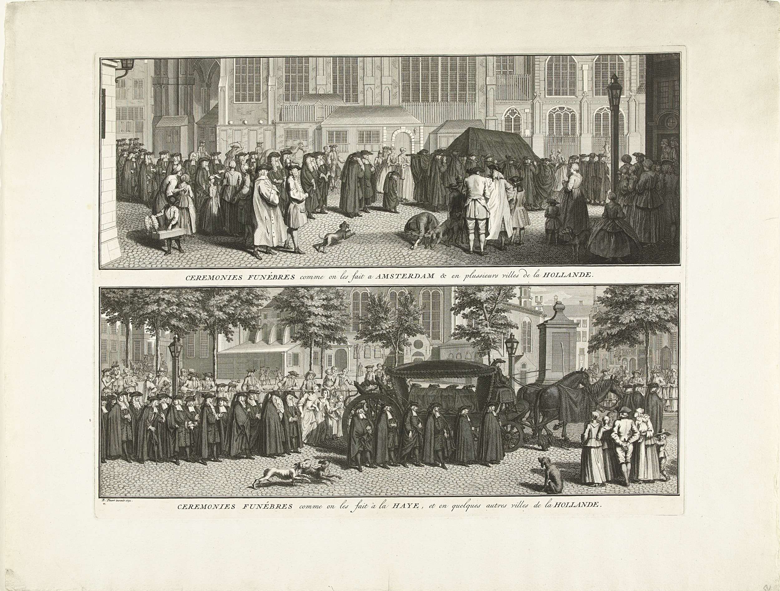 Blad met onder elkaar twee voorstellingen van begrafenisoptochten zoals gebruikelijk bij de gereformeerden te Amsterdam, Den Haag en andere Hollandse steden, ca. 1730. Boven: een rouwstoet in Amsterdam, waarbij de kist door mannen gedragen wordt. Onder: een rouwstoet in Den Haag, waarbij de kist op een koets ligt.