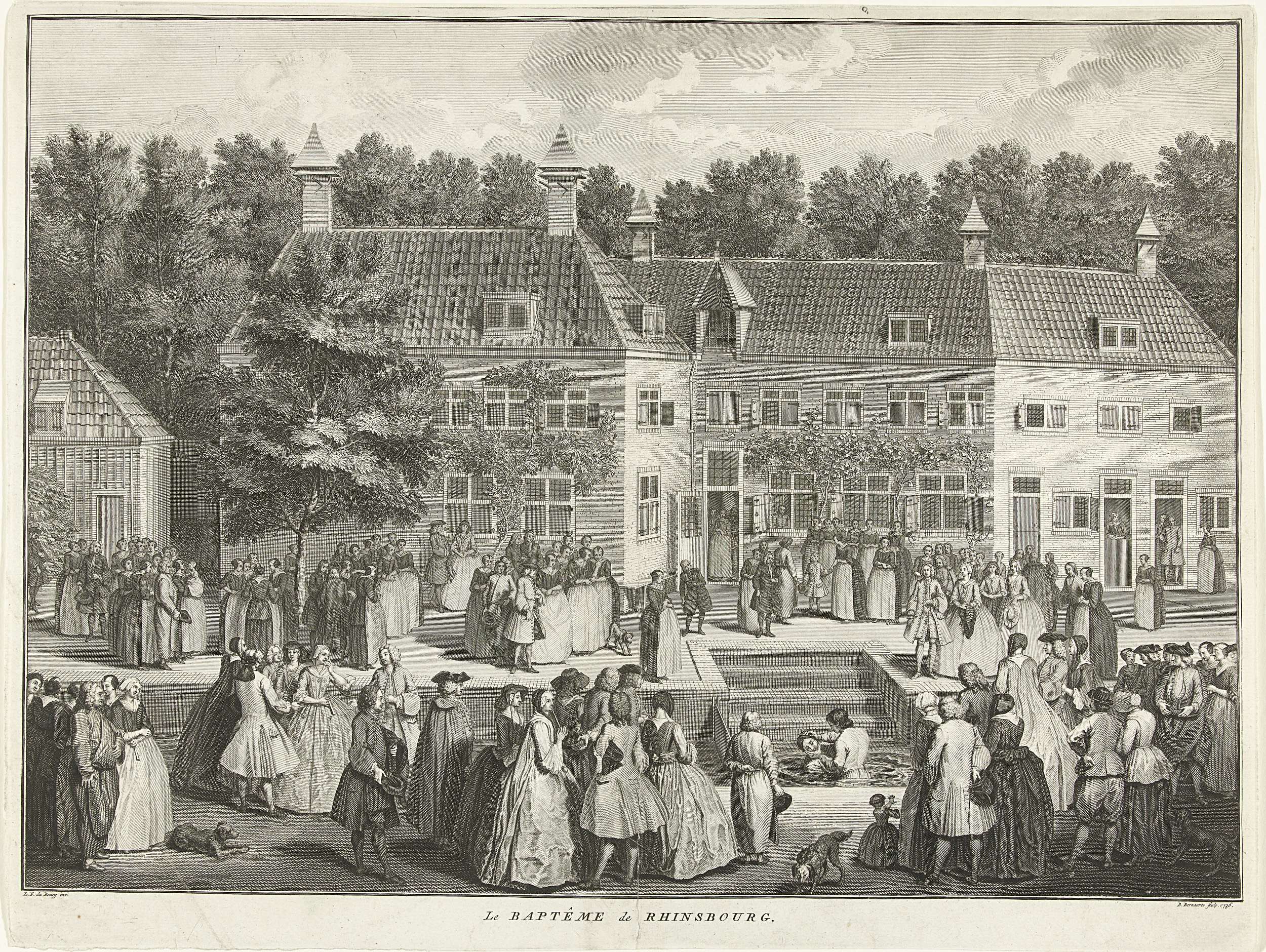 Doopceremonie bij de Rijnsburgse Collegianten, ca. 1735. Doop door onderdompeling van volwassenen in een gracht om het Groot Huis, bijgewoond door de leden van de gemeente.
