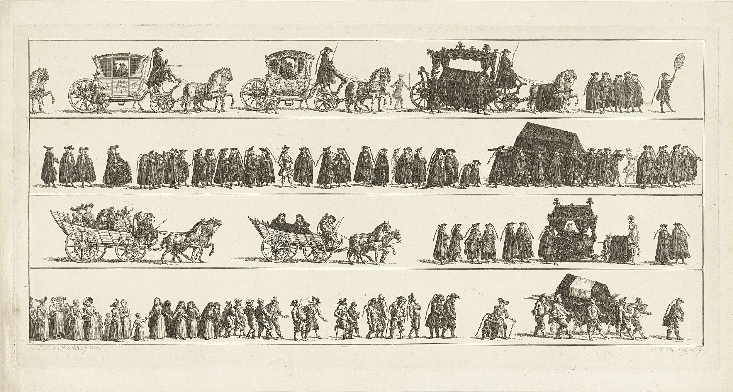 Vergelijking onder elkaar in vier rijen de zes verschillende manieren van begraven bij verschillende lagen van de bevolking in Holland. De verschillende vormen begrafenisoptochten onder elkaar, bij de rijken, de burgers, de boeren en de armen, ca.1750.