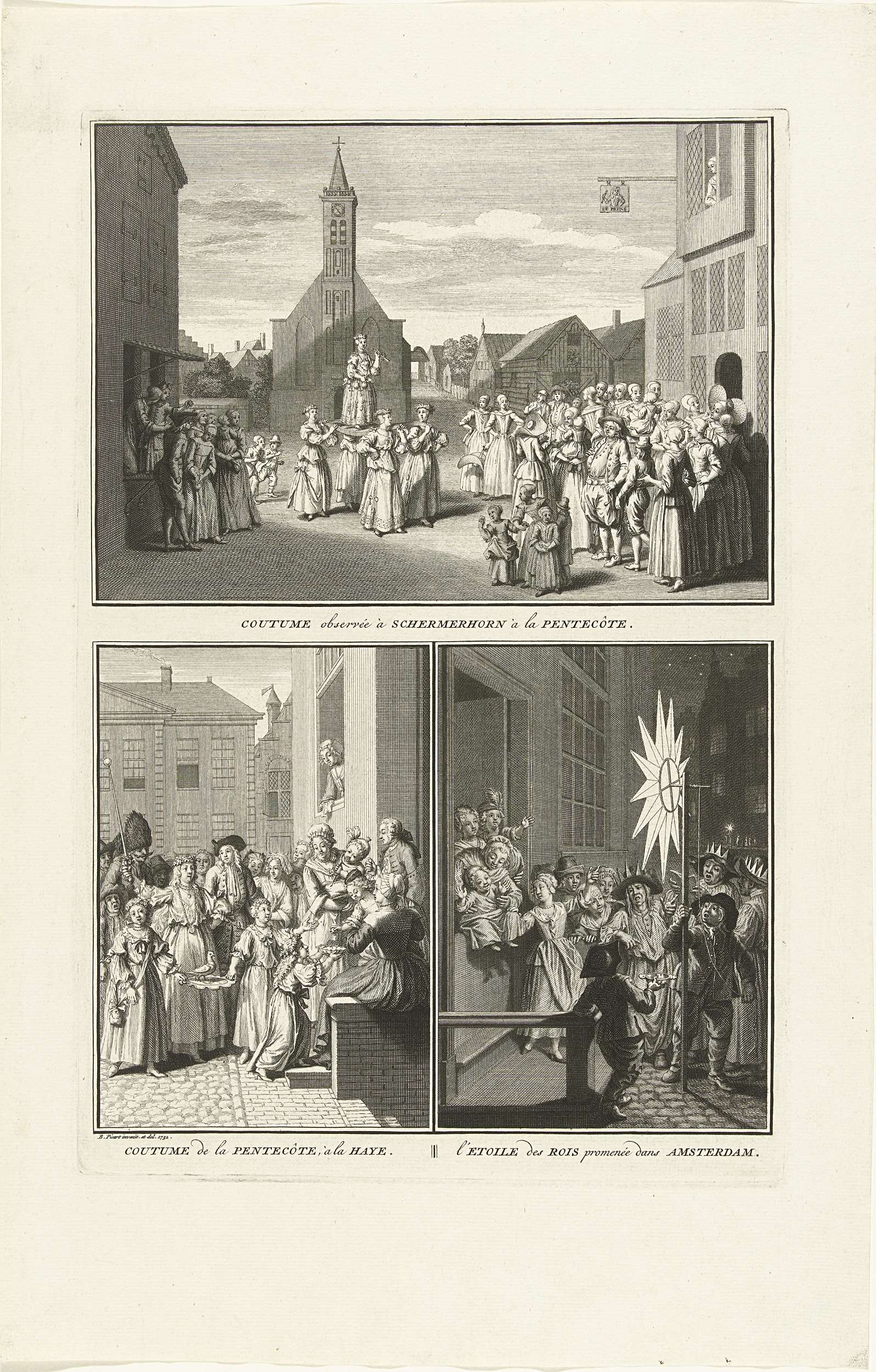 Blad met drie voorstellingen met gebruiken rond Pinksteren en Driekoningen. Boven: op Pinksteren in Schermerhorn wordt een meisje (de Pinksterblom of Pinksterbruid) door vier andere meisjes rondgedragen. Linksonder: in Den Haag gaan met Pinksteren met bloemen versierde meisjes langs de deuren om geld op te halen. Rechtsonder: op Driekoningenavond in Amsterdam gaan mensen zingend langs ...