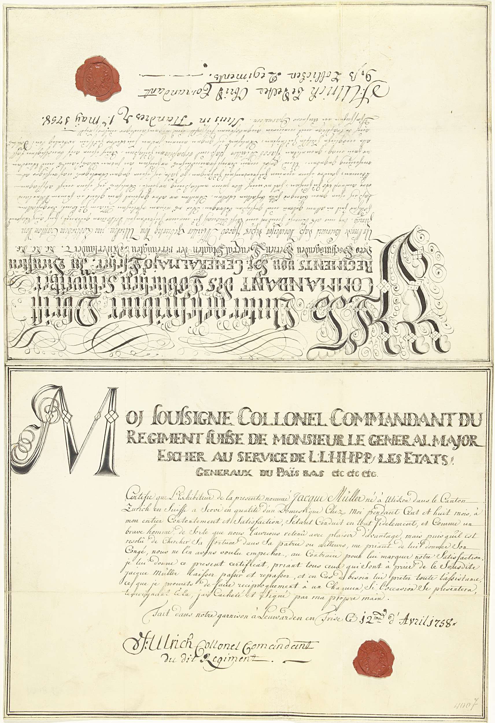 Blad met op beide helften een Duitse en een Franse brief van vrijgeleide voor een Zwitserse overste Jacque / Jacob Müller in Staatse dienst in Sluis in Vlaanderen gedateerd 1 mei en in Leeuwarden 12 april 1758. Handgeschreven documenten met gekalligrafeerde initialen, beide met een lakzegel.