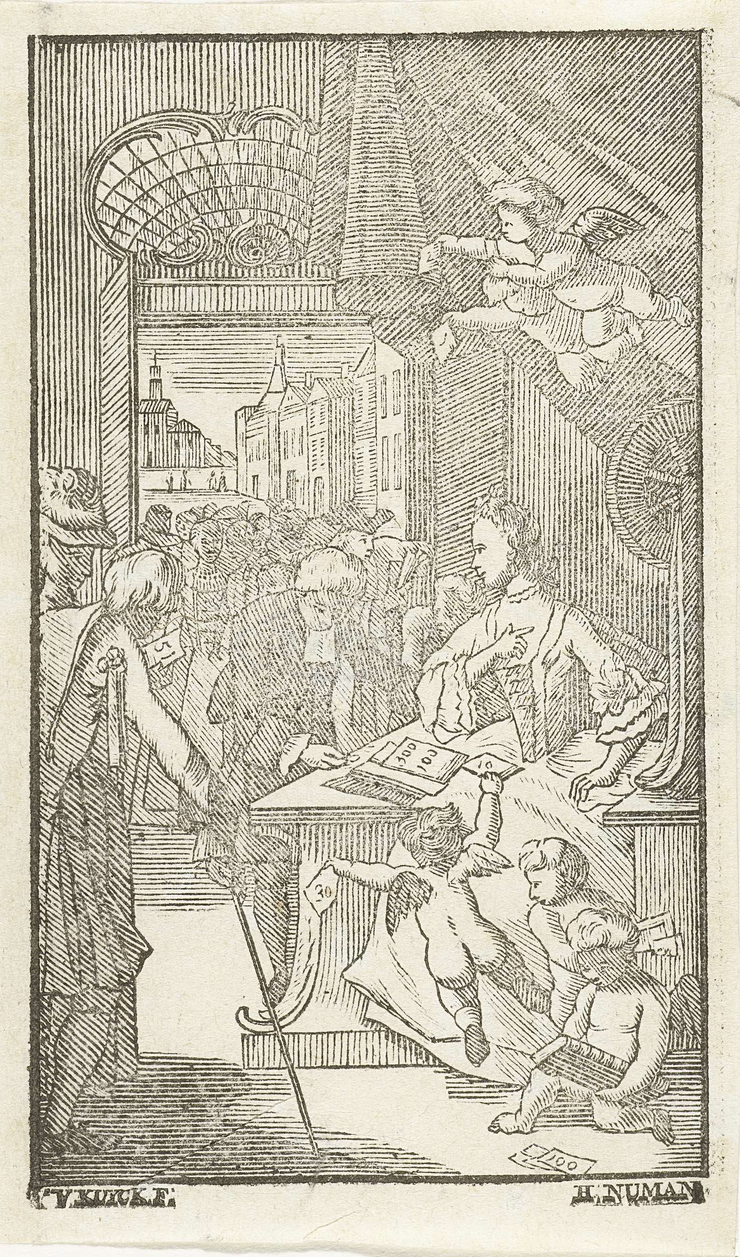 Het uitkeren van de prijzen aan de winnaars van de loterij. Met putti met prijzen en loterijbriefjes. Onderdeel van een serie van drie prenten over het verloop van een loterij.