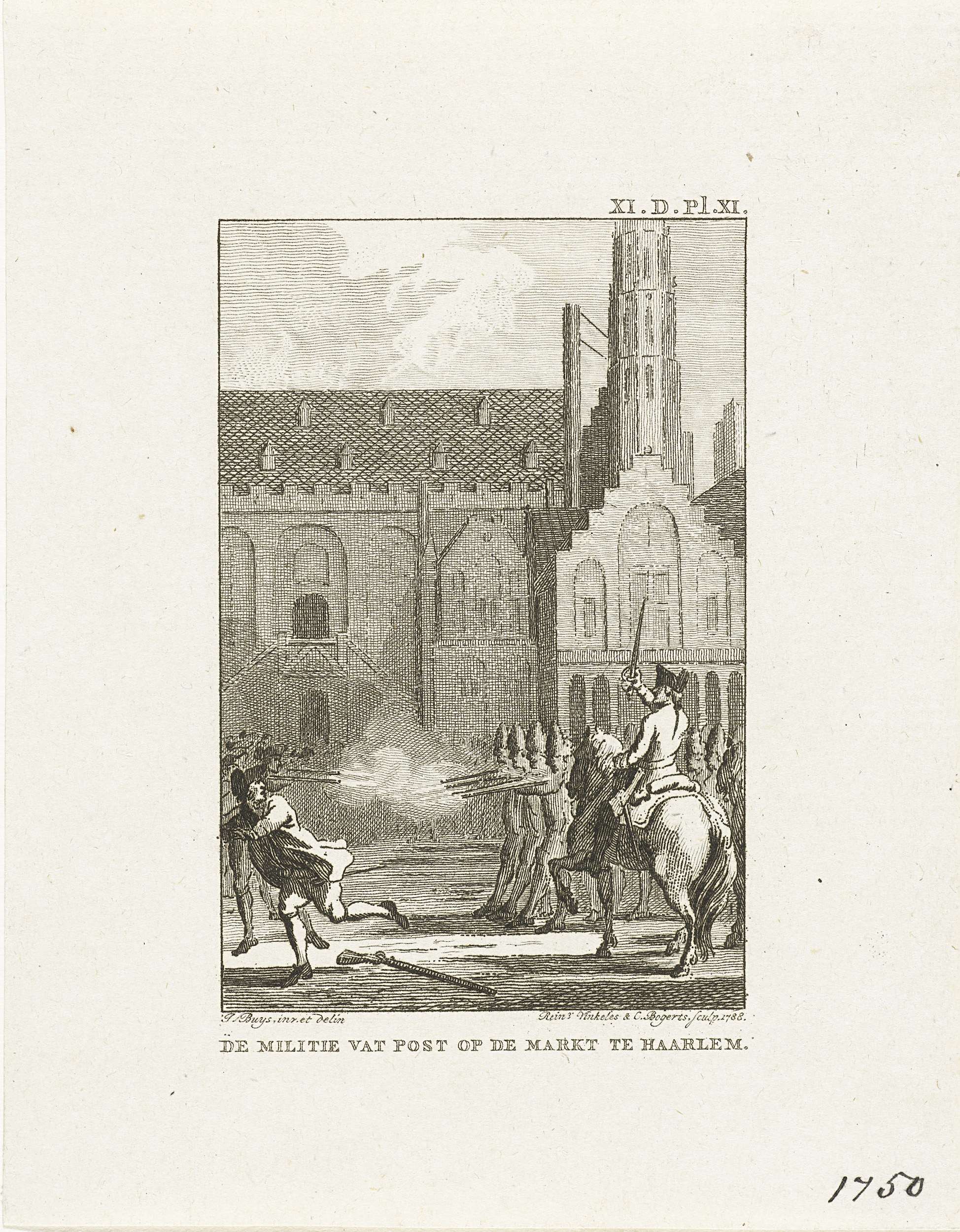 Militie opent het vuur op de oproerige burgers voor het stadhuis op de Grote Markt te Haarlem tijdens het Pachtersoproer, januari 1750. Gemerkt rechtsboven: XI. D. Pl. XI.