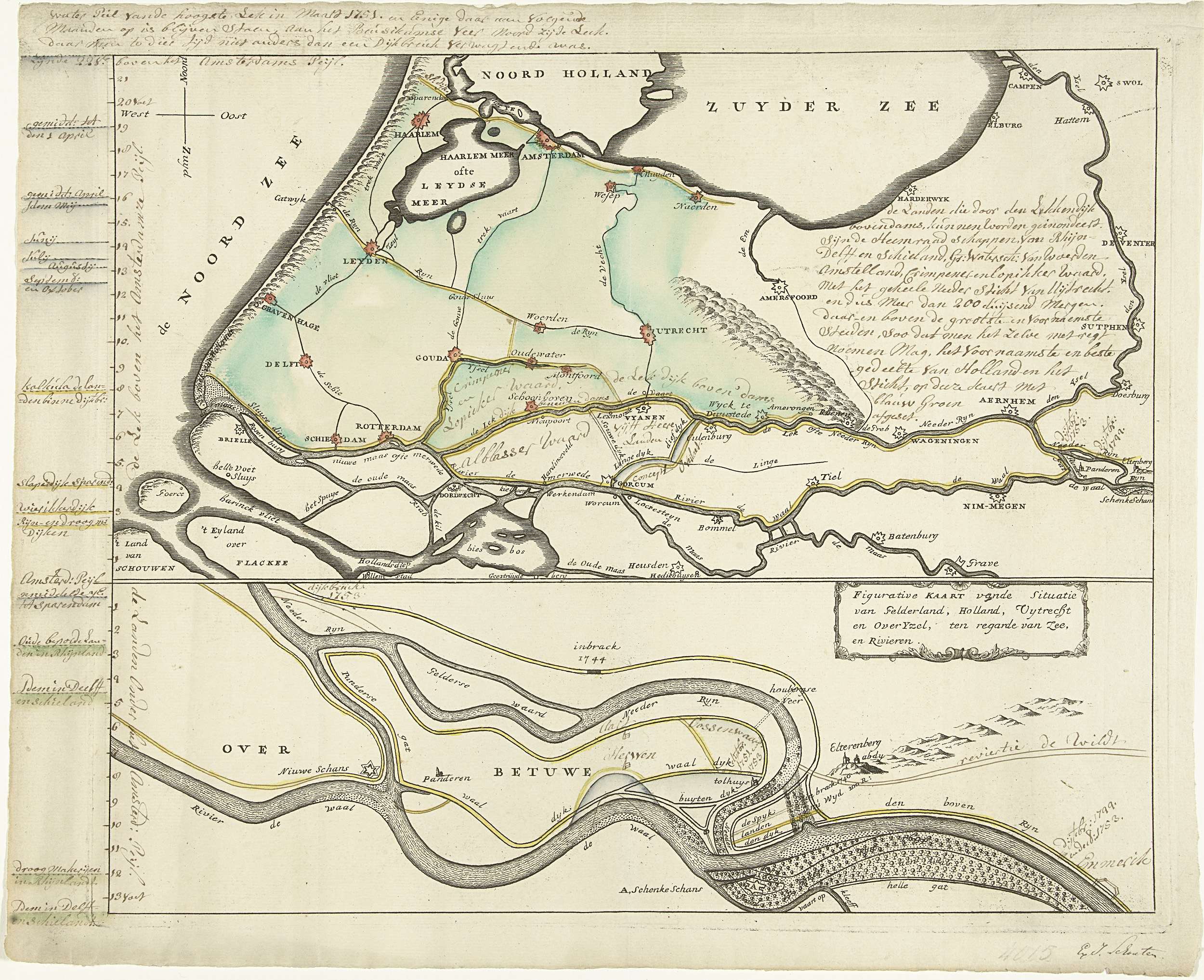 Kaart van het rivierengebied in Holland, Utrecht en Gelderland met de hoge waterstand in de rivieren de Lek en de Waal, maart 1751. Links waterstanden onder en boven Amsterdams Peil. Met verschillende teksten en opschriften in handschrift in de voorstelling. Rechtsonder de vermelding van een naam: Ey. J. Schouten.