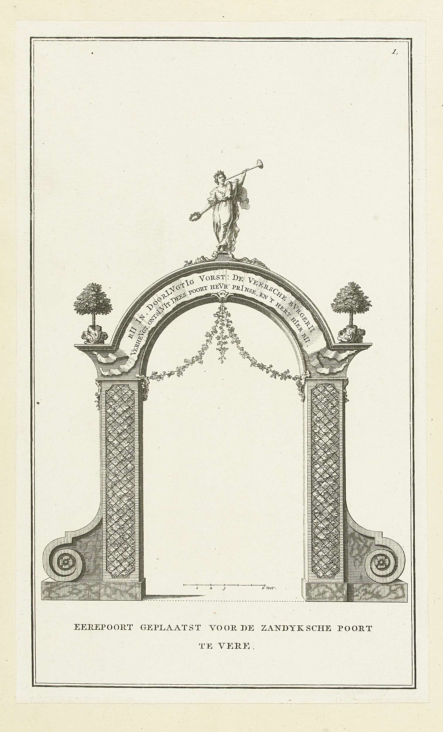 De erepoort geplaatst bij de Zanddijkse Poort. Onderdeel van de illustraties van de feestelijke inhuldiging van stadhouder Willem IV als markgraaf van Veere op 1 juni 1751. Genummerd rechtsboven: 1.