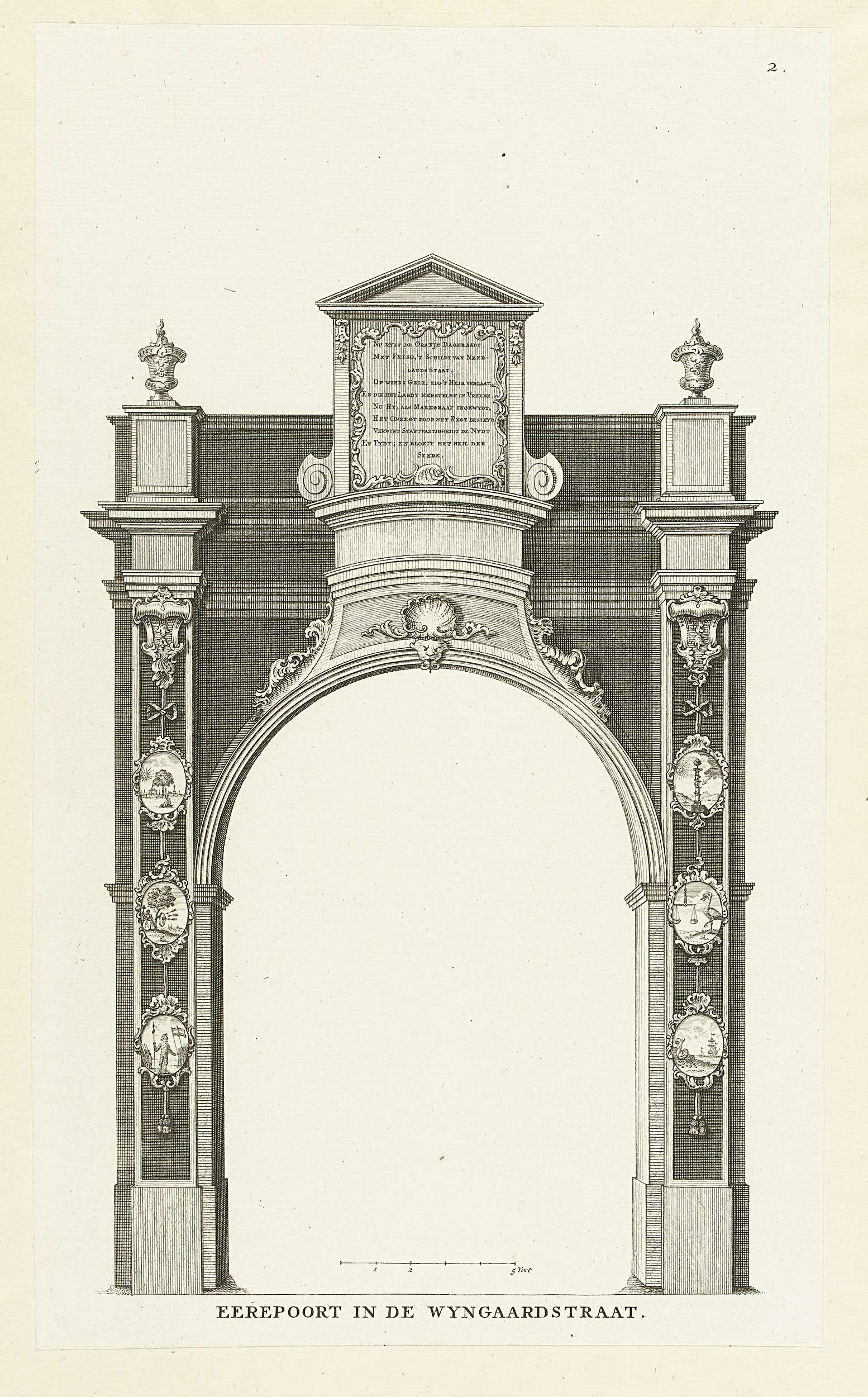De erepoort geplaatst in de Wijngaardstraat. Onderdeel van de illustraties van de feestelijke inhuldiging van stadhouder Willem IV als markgraaf van Veere op 1 juni 1751. Genummerd rechtsboven: 2.