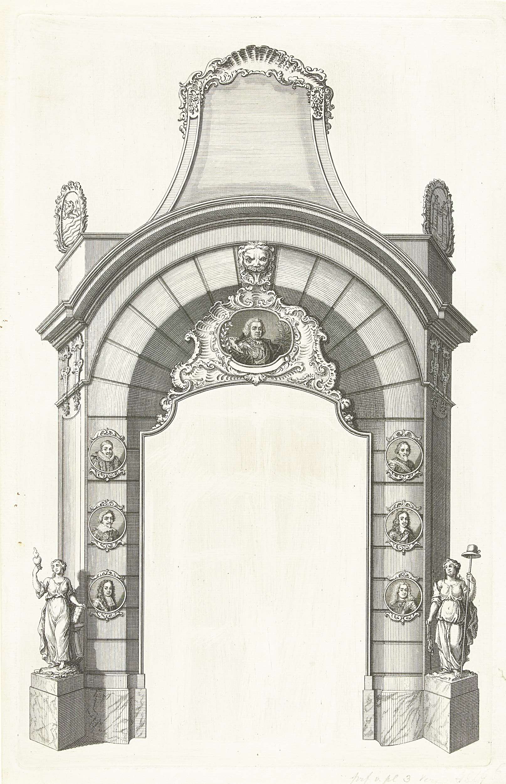 De erepoort geplaatst bij de Grote Brug. Op de boog portretten van stadhouder Willem IV en zijn voorgangers, met standbeelden van Godsdienst en Vrijheid. Onderdeel van de illustraties van de feestelijke inhuldiging van stadhouder Willem IV als markgraaf van Veere op 1 juni 1751.