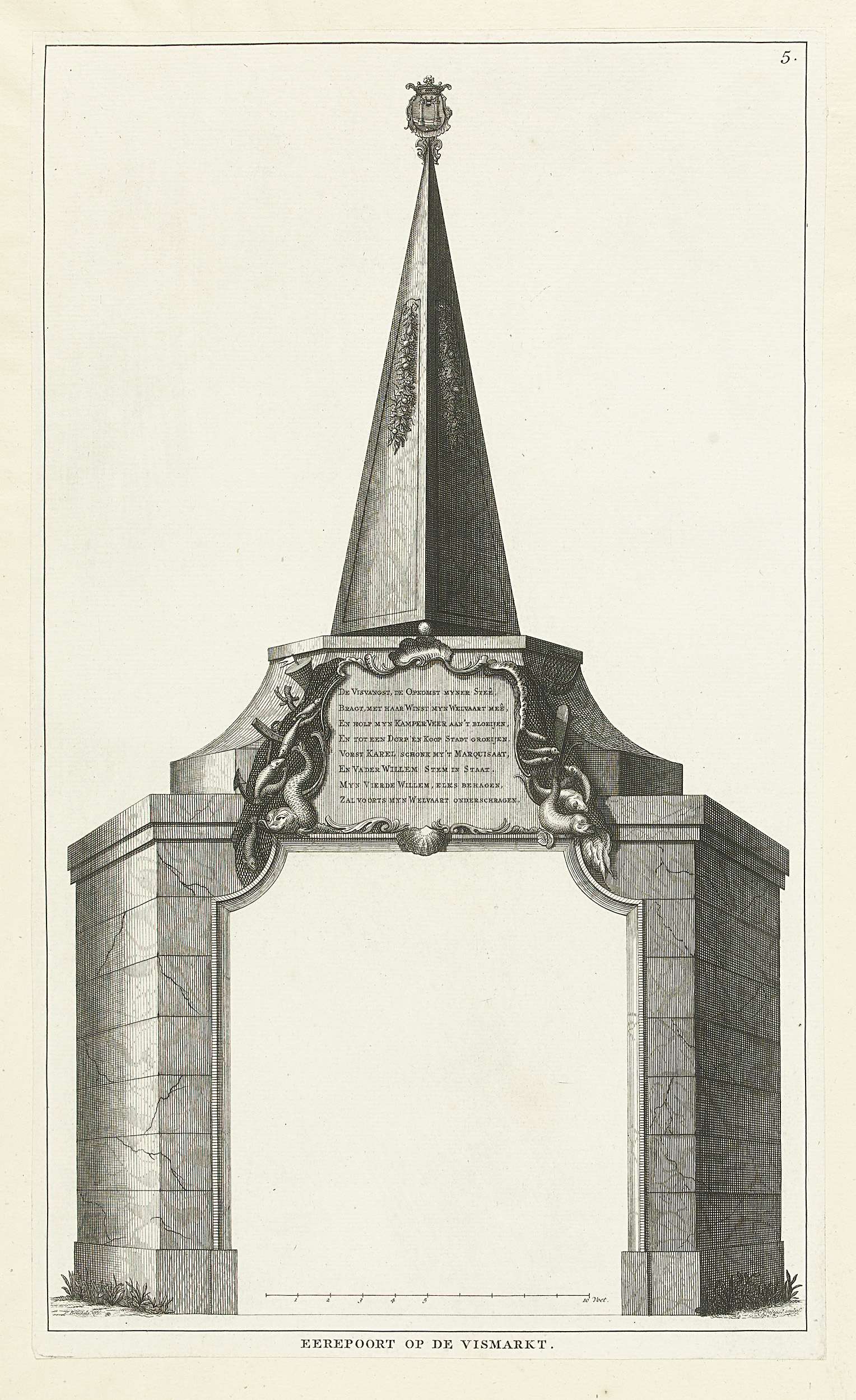 De erepoort geplaatst op de vismarkt. Op de boog vissen, visnetten en een obelisk. Onderdeel van de illustraties van de feestelijke inhuldiging van stadhouder Willem IV als markgraaf van Veere op 1 juni 1751. Genummerd rechtsboven: 5.