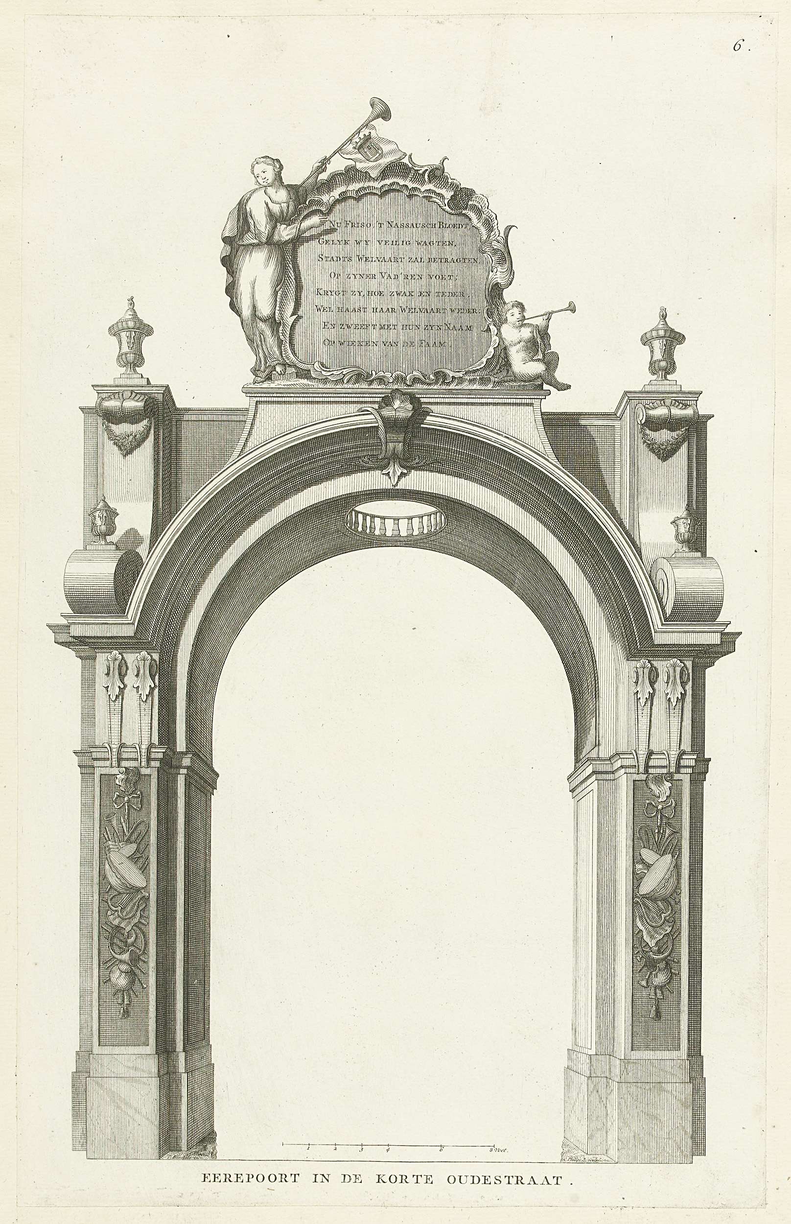 De erepoort geplaatst in de Korte Oudestraat. Onderdeel van de illustraties van de feestelijke inhuldiging van stadhouder Willem IV als markgraaf van Veere op 1 juni 1751. Genummerd rechtsboven: 6.