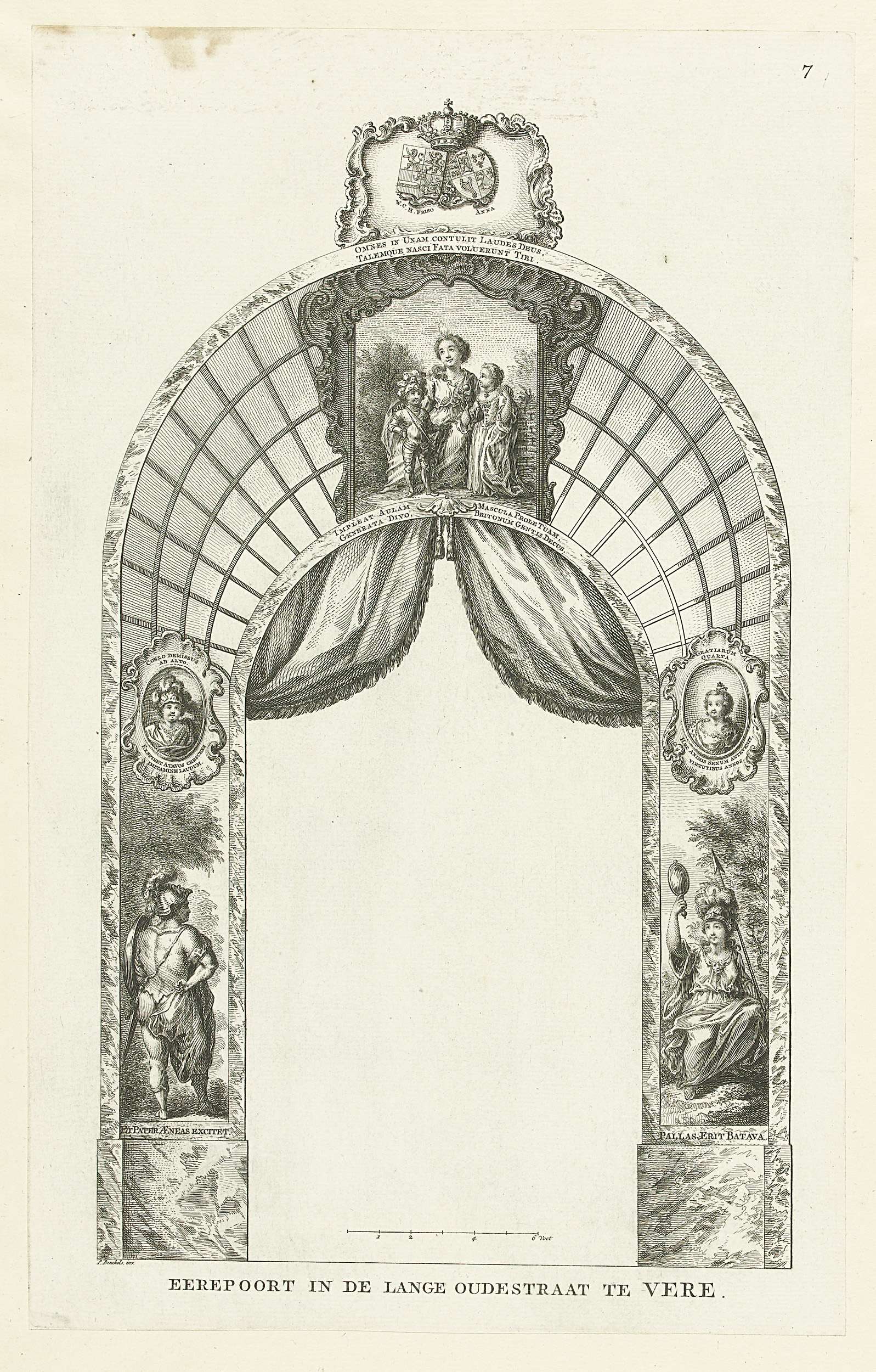 De erepoort geplaatst in de Lange Oudestraat. Op de boog portretten van Anna van Hannover en de kinderen prins Willem V en prinses Carolina. Onderdeel van de illustraties van de feestelijke inhuldiging van stadhouder Willem IV als markgraaf van Veere op 1 juni 1751. Genummerd rechtsboven: 7.