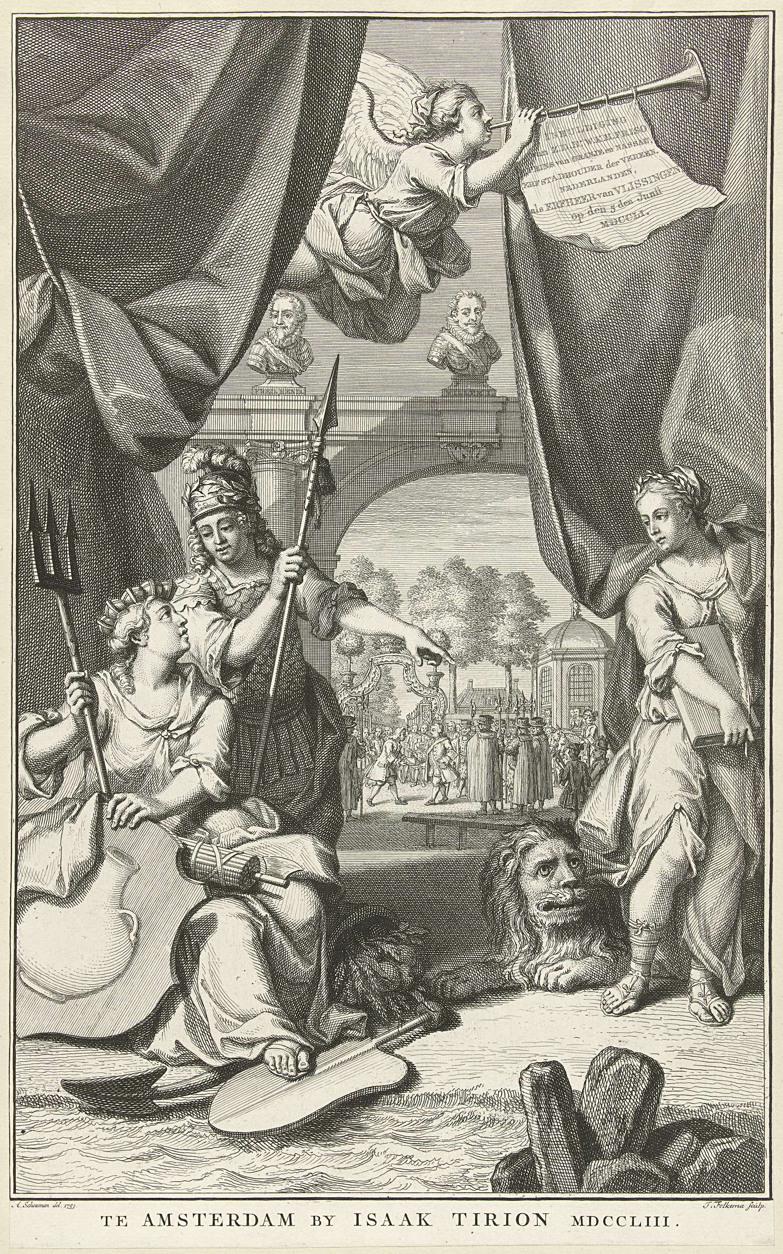 Allegorische titelplaat met het aanbieden van de sleutels van de stad aan de stadhouder. Op de voorgrond de stadsmaagd van Vlissingen met Mars, rechts de Geschiedenis, in de lucht de Faam. Onderdeel van de illustraties van de inhuldiging van Willem IV als erfheer van Vlissingen op 5 juni 1751.