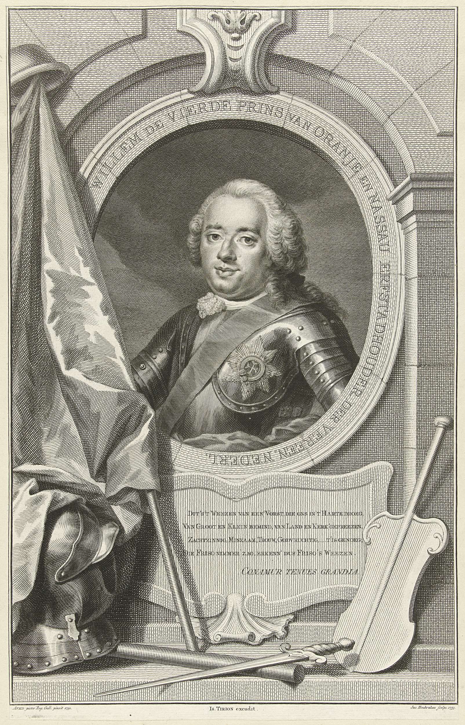 Portret van standhouder Willem IV in wapenrusting, ovaal in een stenen muur. Voor het portret een vaandel, helm, roer en dolk. Onder het portret een vers door het Vlissingse dichtersgenootschap 'Conamur tenues grandia'. Onderdeel van de illustraties van de inhuldiging van Willem IV als erfheer van Vlissingen op 5 juni 1751.