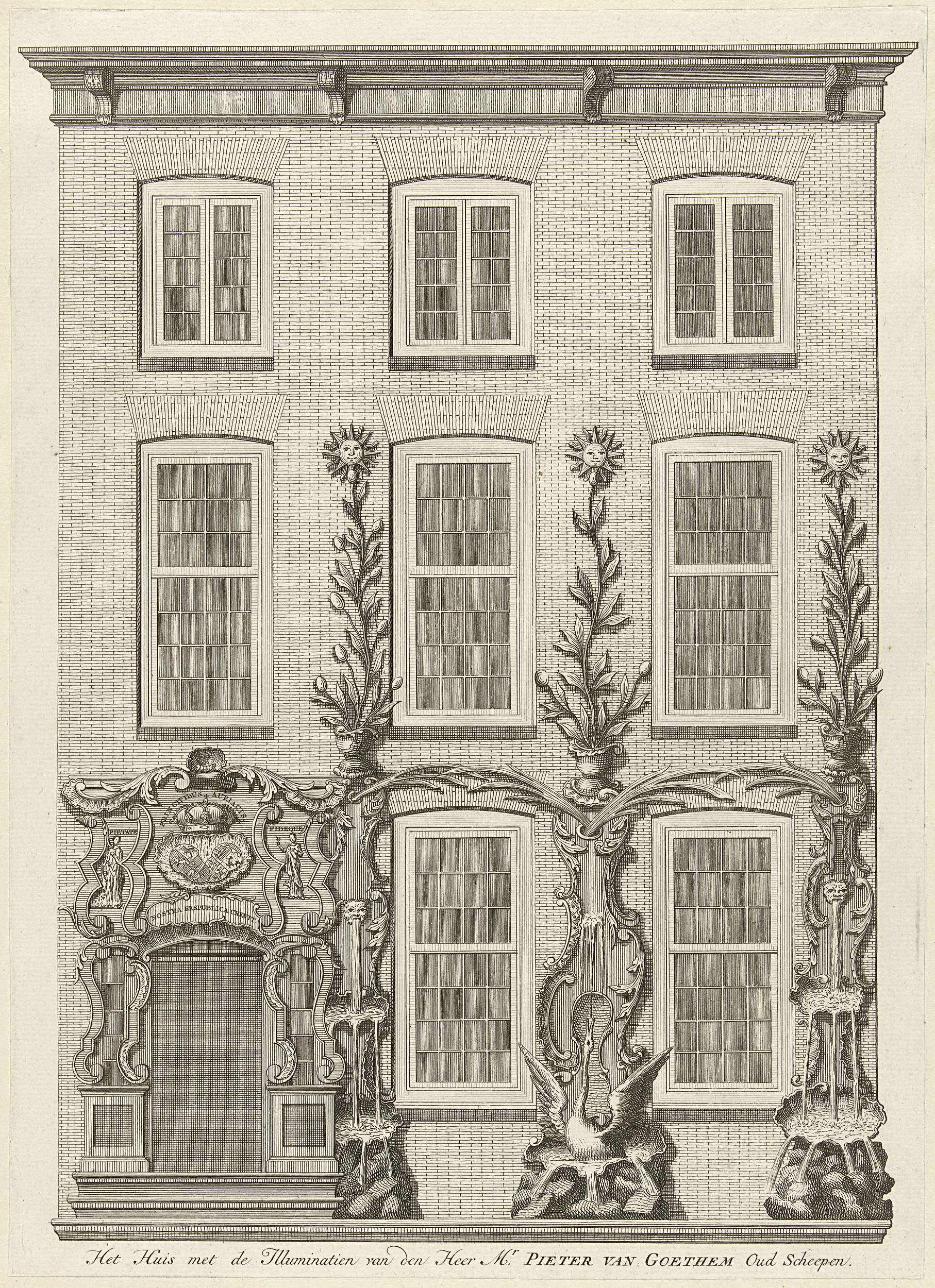 Illuminatie met fonteinen aangebracht op het huis van Mr. Pieter van Goethem, oudschepen van Vlissingen, ter ere van het bezoek van de stadhouder. Onderdeel van de illustraties van de inhuldiging van Willem IV als erfheer van Vlissingen op 5 juni 1751.