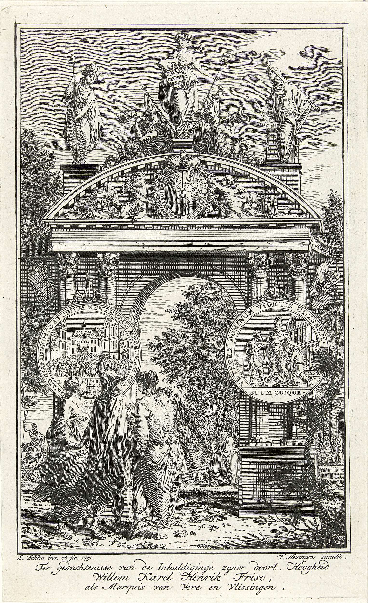 Allegorie op de inhuldiging van stadhouder Willem IV te Veere en Vlissingen op 1 en 5 juni 1751.Triomfpoort met allegorische figuren en de bij deze gelegenheid geslagen penning.