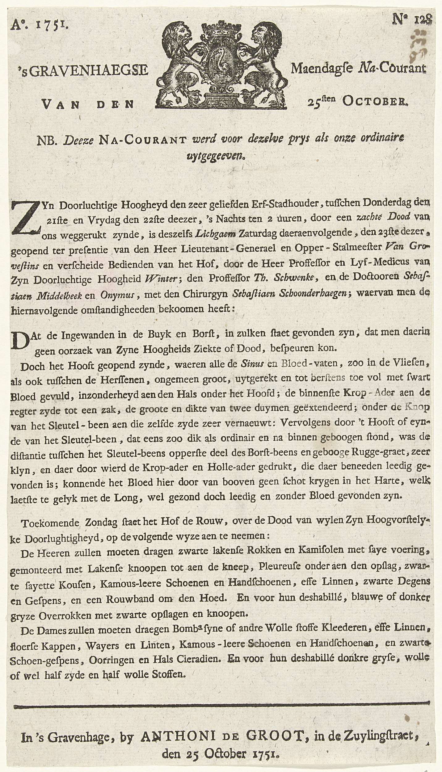 Nacourant bij de 's Gravenhaegse Maendagse Courant van 25 oktober, afl. nr. 128, met een bericht over de lijkschouwing van de overleden prins Willem IV en van de rouwkleding op het hof. Blad bedrukt op één zijde, bovenaan een vignet met het wapen van Den Haag.