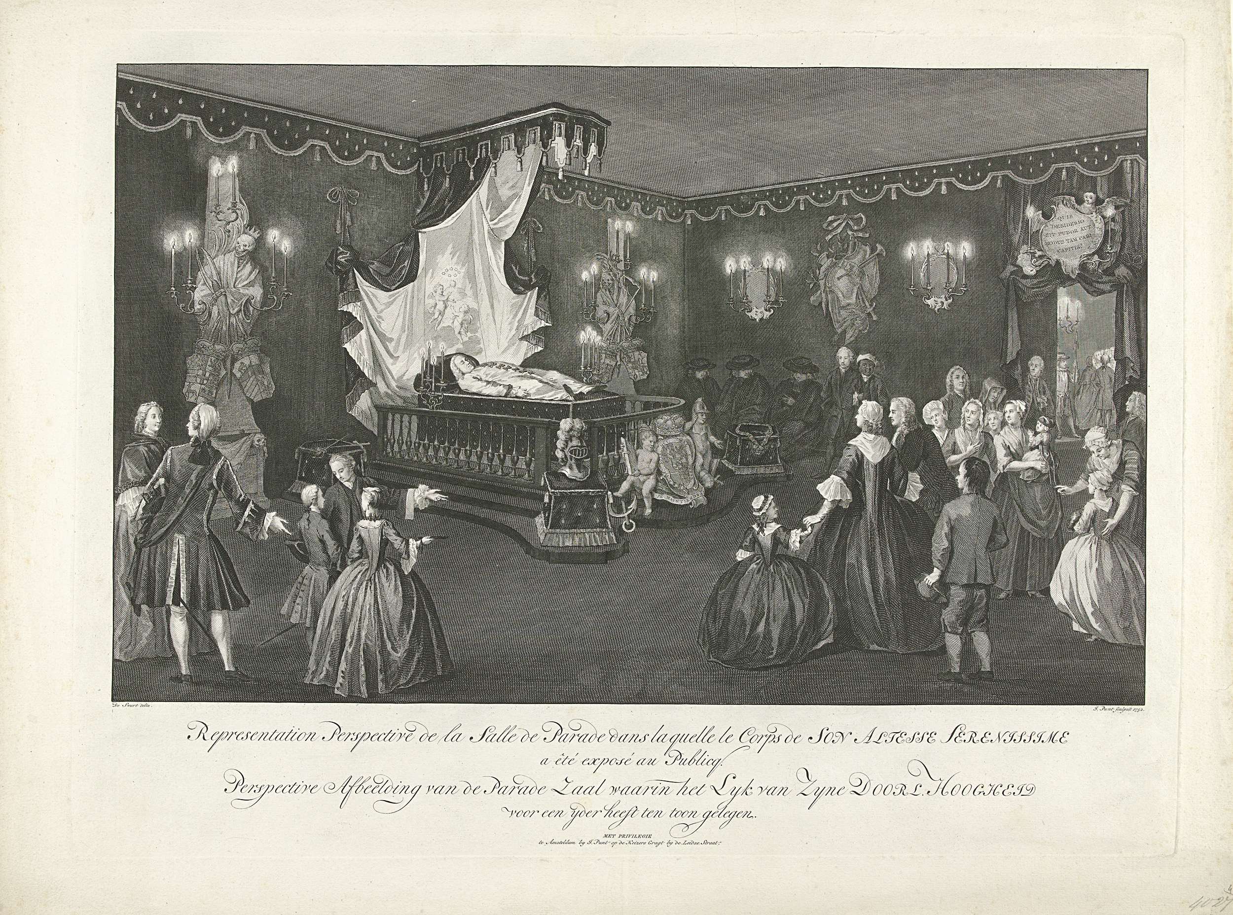 Gezicht in de zaal met bezoekers voor het praalbed met het lichaam van prins Willem IV. Onderdeel van de serie van vier platen van het praalbed waarop de op 22 oktober overleden prins Willem IV gedurende de maanden november en december van het jaar 1751 opgebaard heeft gelegen.