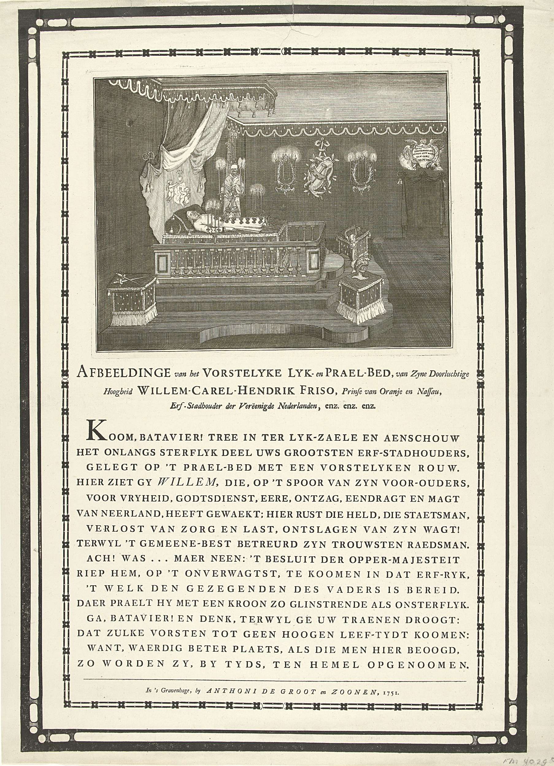 Rouwkamer met het praalbed van de op 22 oktober overleden prins Willem IV en waarop hij gedurende de maanden november en december van het jaar 1751 opgebaard heeft gelegen. Op het blad onder de plaat staat een vers. Met zwarte rouwranden om de plaat en het vers.