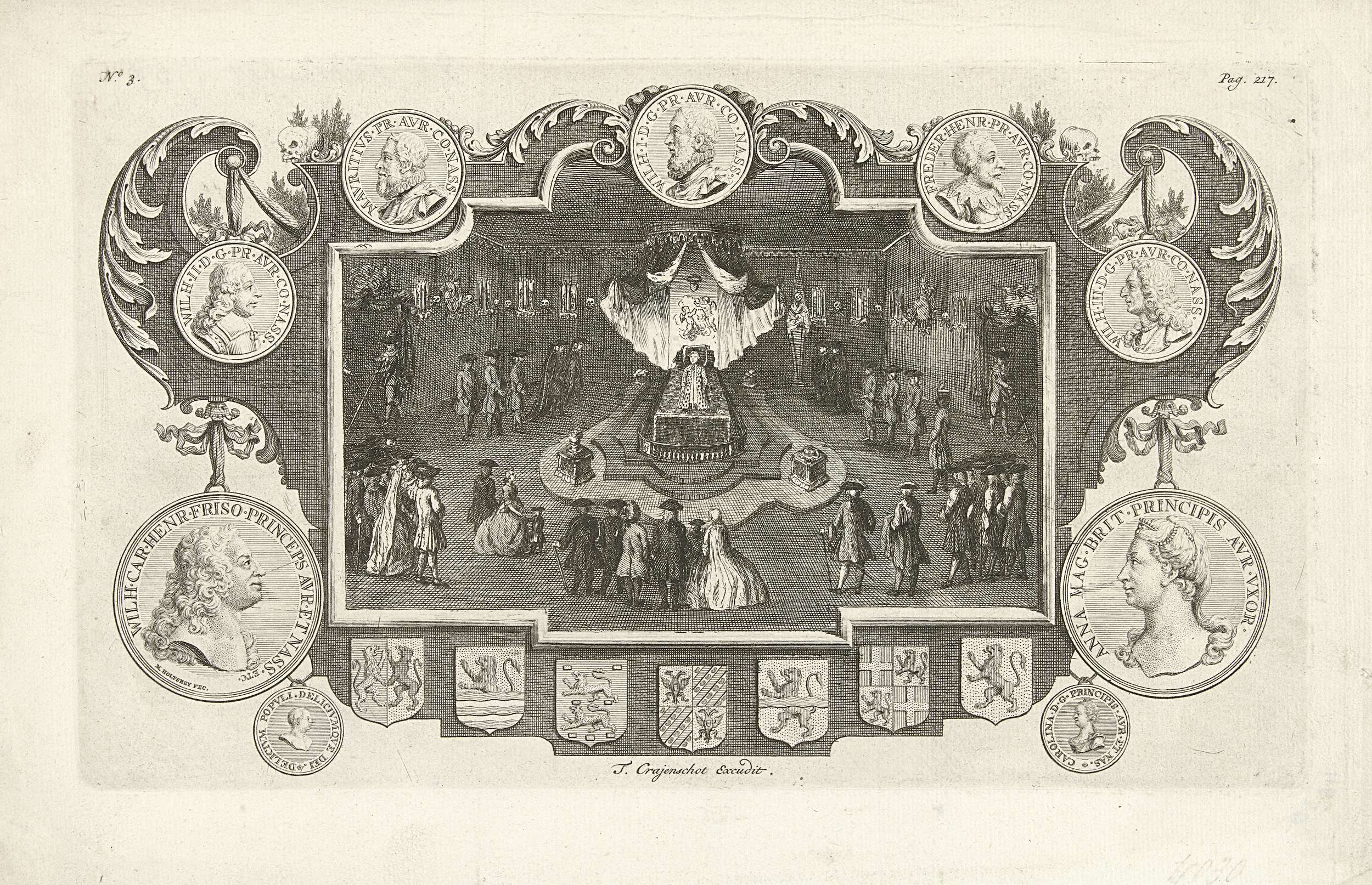 Rouwkamer met bezoekers bij het praalbed van de op 22 oktober overleden prins Willem IV en waarop hij gedurende de maanden november en december van het jaar 1751 opgebaard heeft gelegen. De voorstelling in een omlijsting met wapens van de zeven provincies, penningen met portretten van de stadhouder, vrouw en kinderen en voorvaderen. Gemerkt bovenaan ...