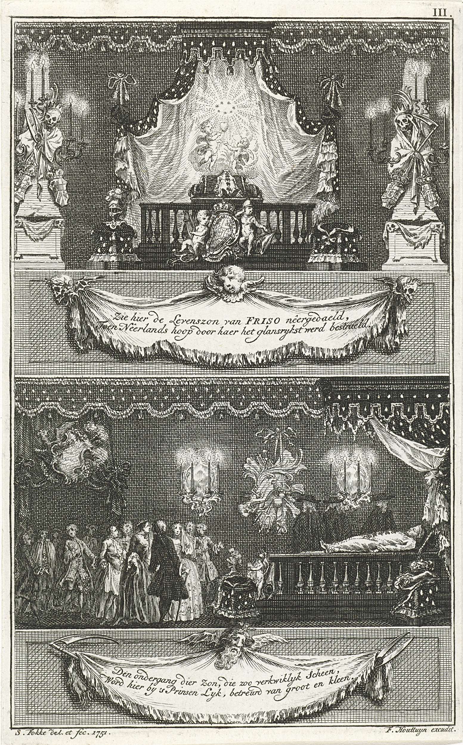 Blad met twee kleine voorstellingen van de rouwkamer met bezoekers en van het praalbed van de op 22 oktober overleden prins Willem IV en waarop hij gedurende de maanden november en december van het jaar 1751 opgebaard heeft gelegen. Onder beide voorstellingen een hangende doek met opschrift. Gemerkt rechtsboven: III.