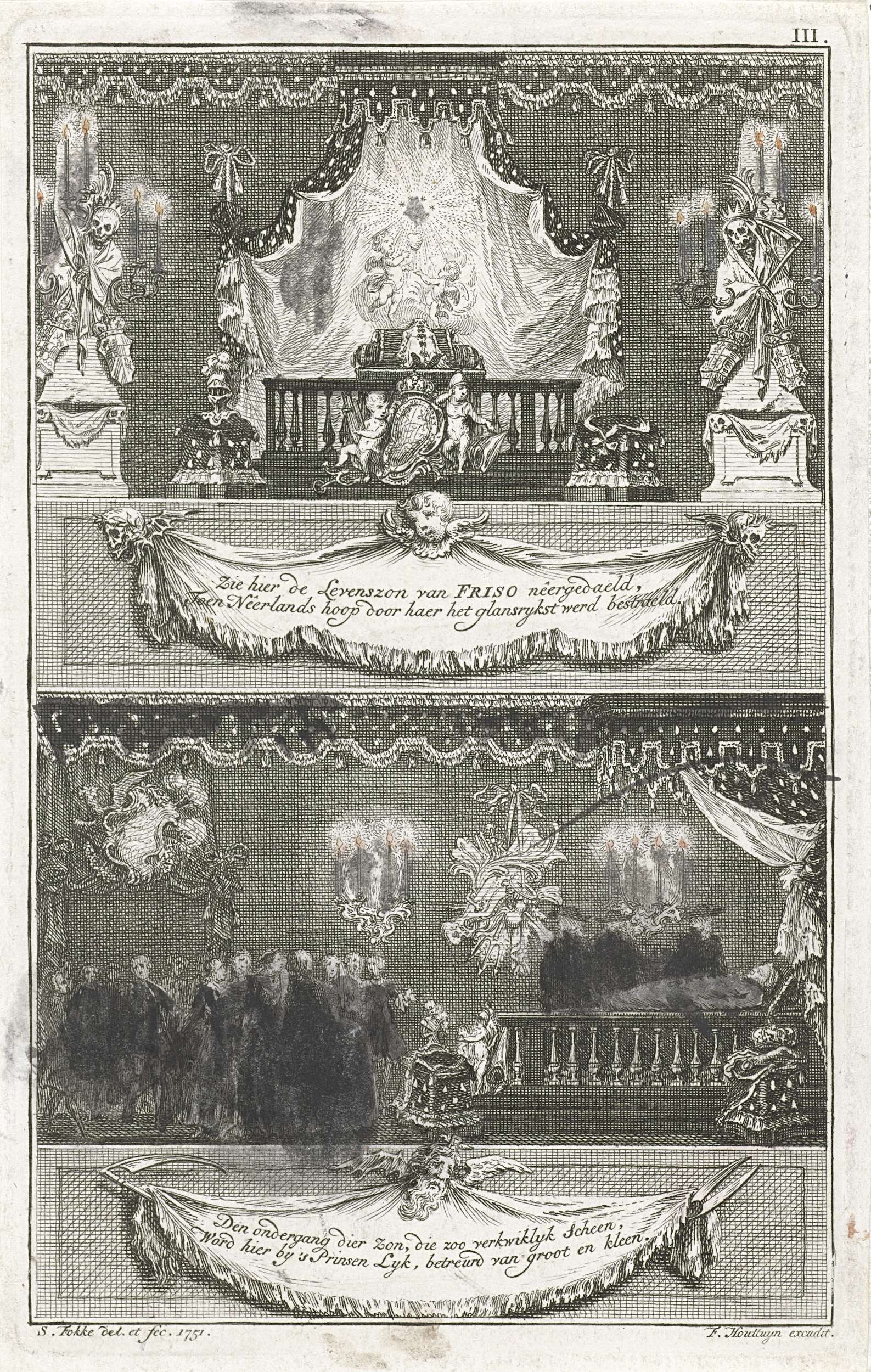 Blad met twee kleine voorstellingen van de rouwkamer met bezoekers en van het praalbed van de op 22 oktober overleden prins Willem IV en waarop hij gedurende de maanden november en december van het jaar 1751 opgebaard heeft gelegen. Onder beide voorstellingen een hangende doek met opschrift. Gemerkt rechtsboven: III.