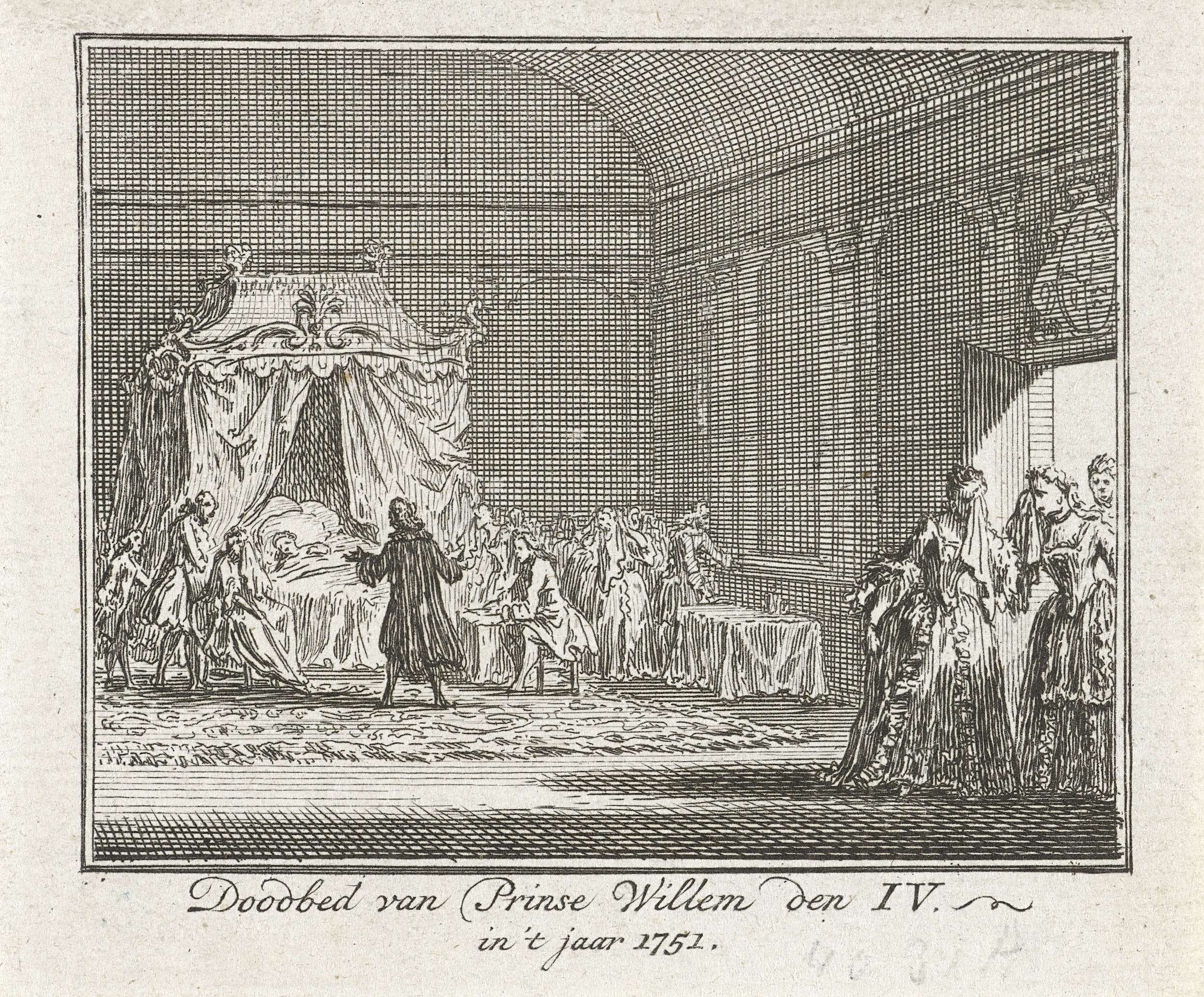 Het overlijden op 22 oktober 1751 van prins Willem IV. Slaapkamer met de prins op zijn doodsbed, omringd door familie en leden van de hofhouding.